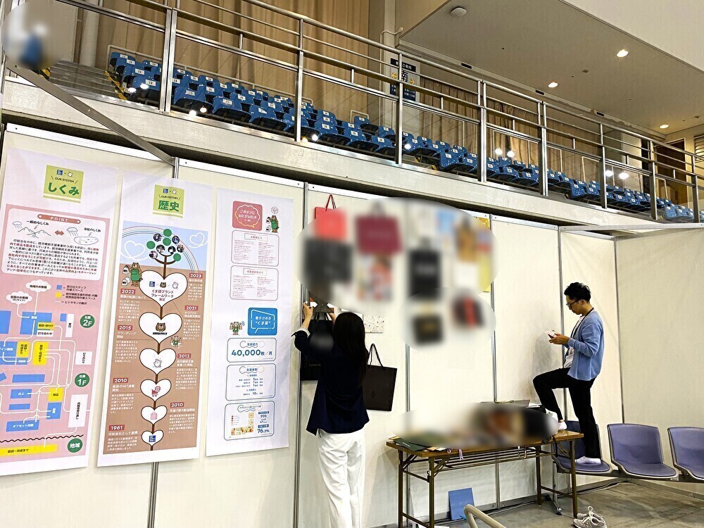 こんにちは!まっつんです 本日から二日間、福岡で開催される九州印刷情報産業展に出展中です! ブースにはスタッフ3人で皆様をお出迎えします。 お陰様で大盛況です! 今回、ブースの看板代わりに特別仕様の巨大な手提げ袋を製作しました! ぜひお立ち寄りください 🙂