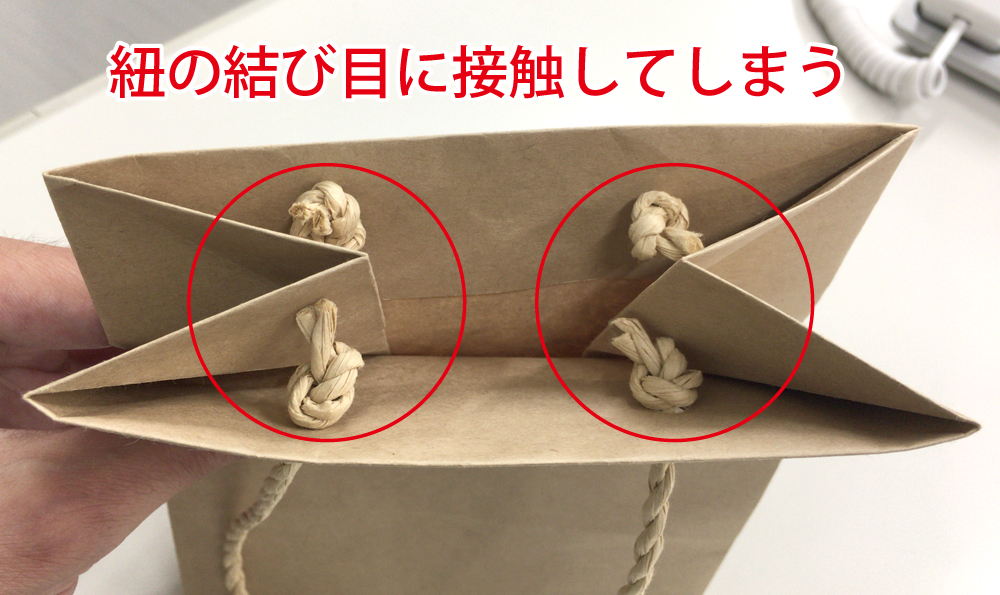 この現象は正面横幅とマチ幅の寸法が近いほど起こります。