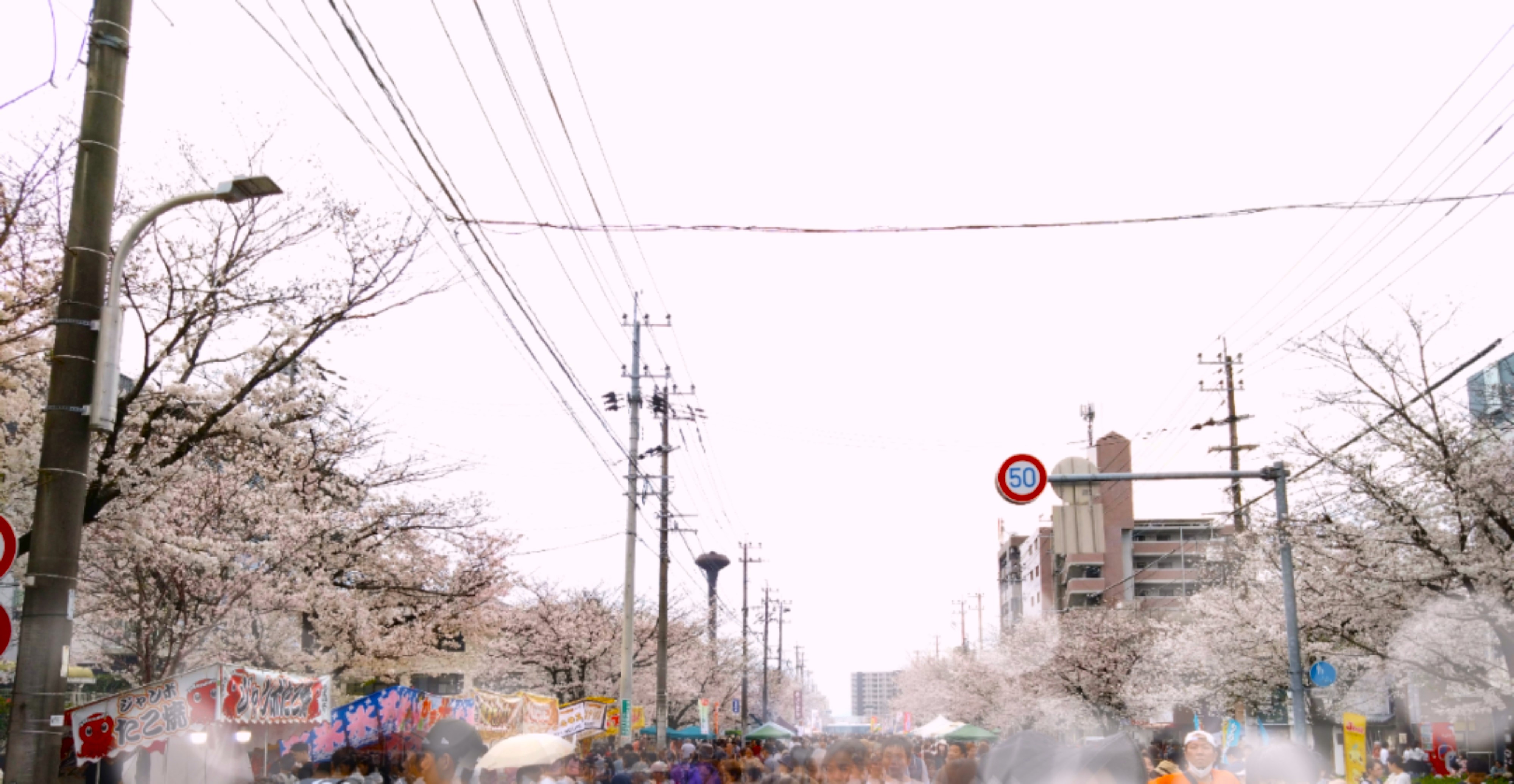 この前の日曜日に訪れた健軍自衛隊通りの桜まつりでは、歩行者天国になった道路にたくさんの出店が並び、多くの観覧者で賑わっていました。