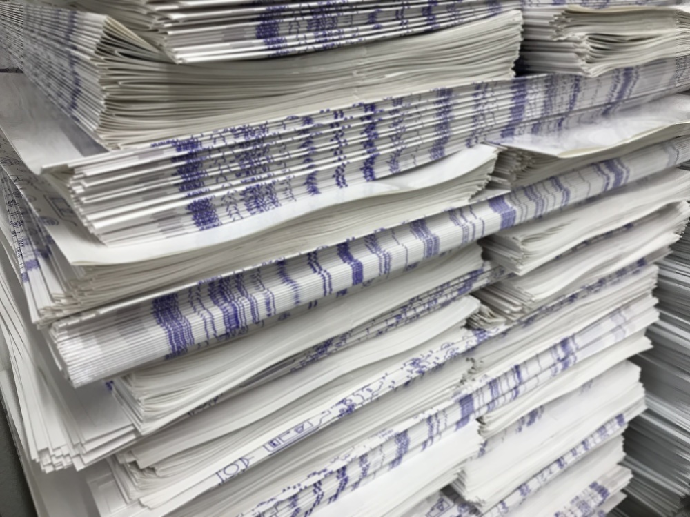 ワイン瓶を入れる手提げ袋です。一面に絵柄が入っていてポップな印象。もともと艶やかなコート紙ですが、更にグロスPP加工をすることで表面の擦れや水に塗れた時など、色移りを防ぐ効果があります。
