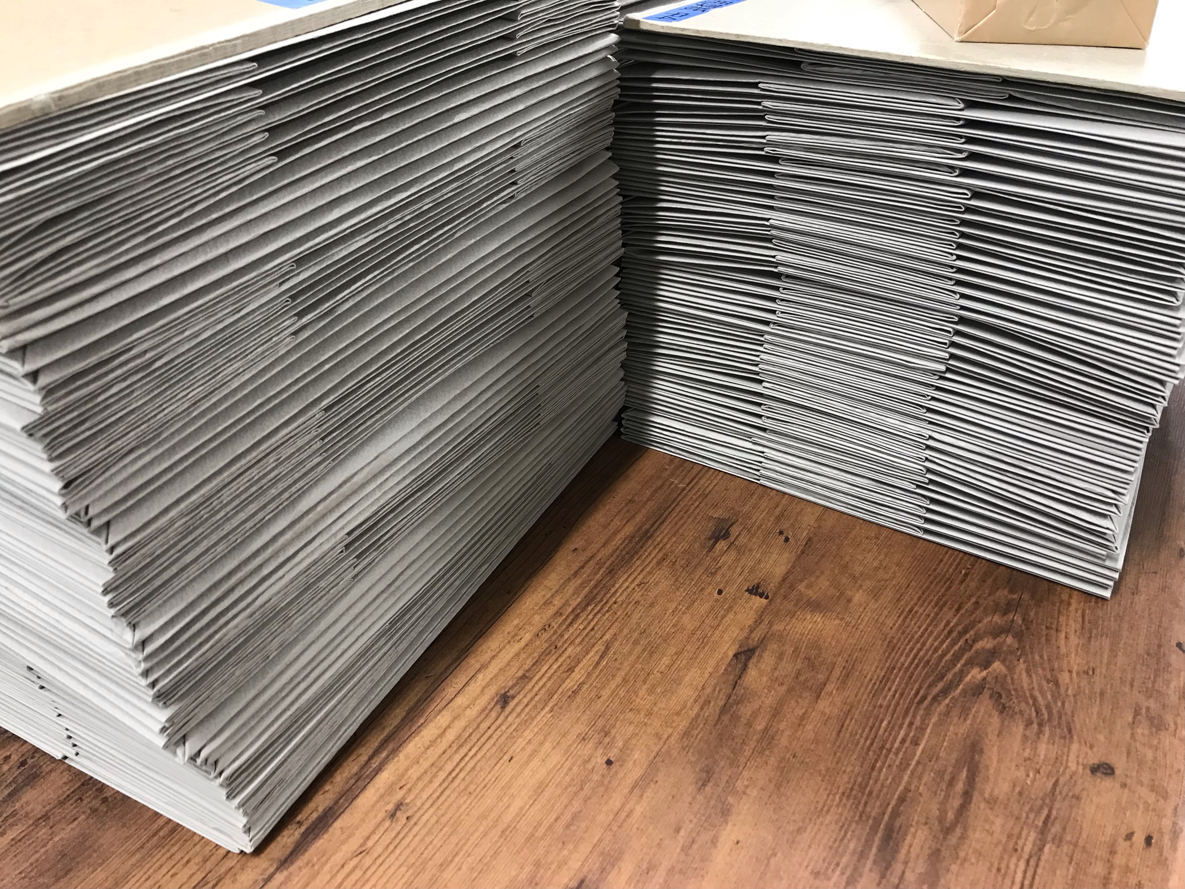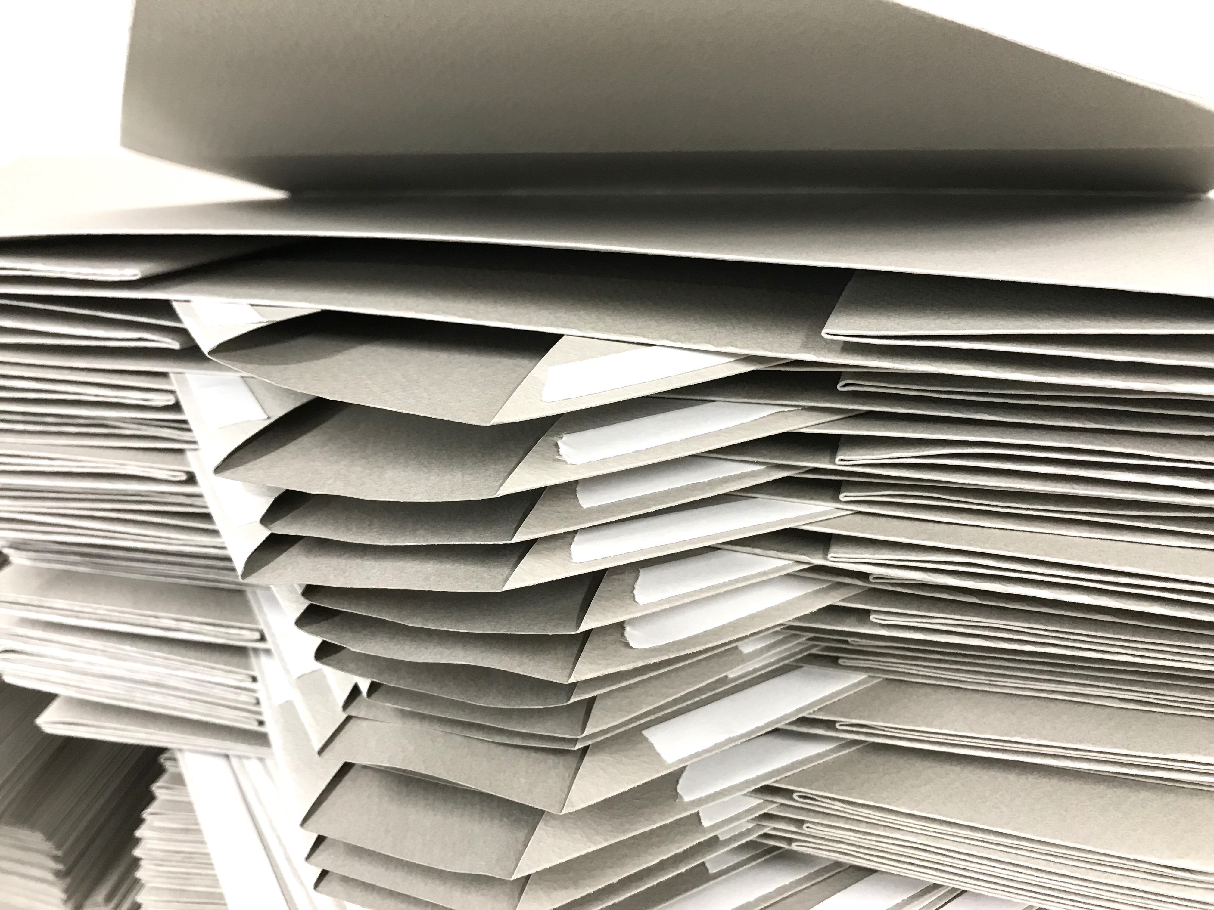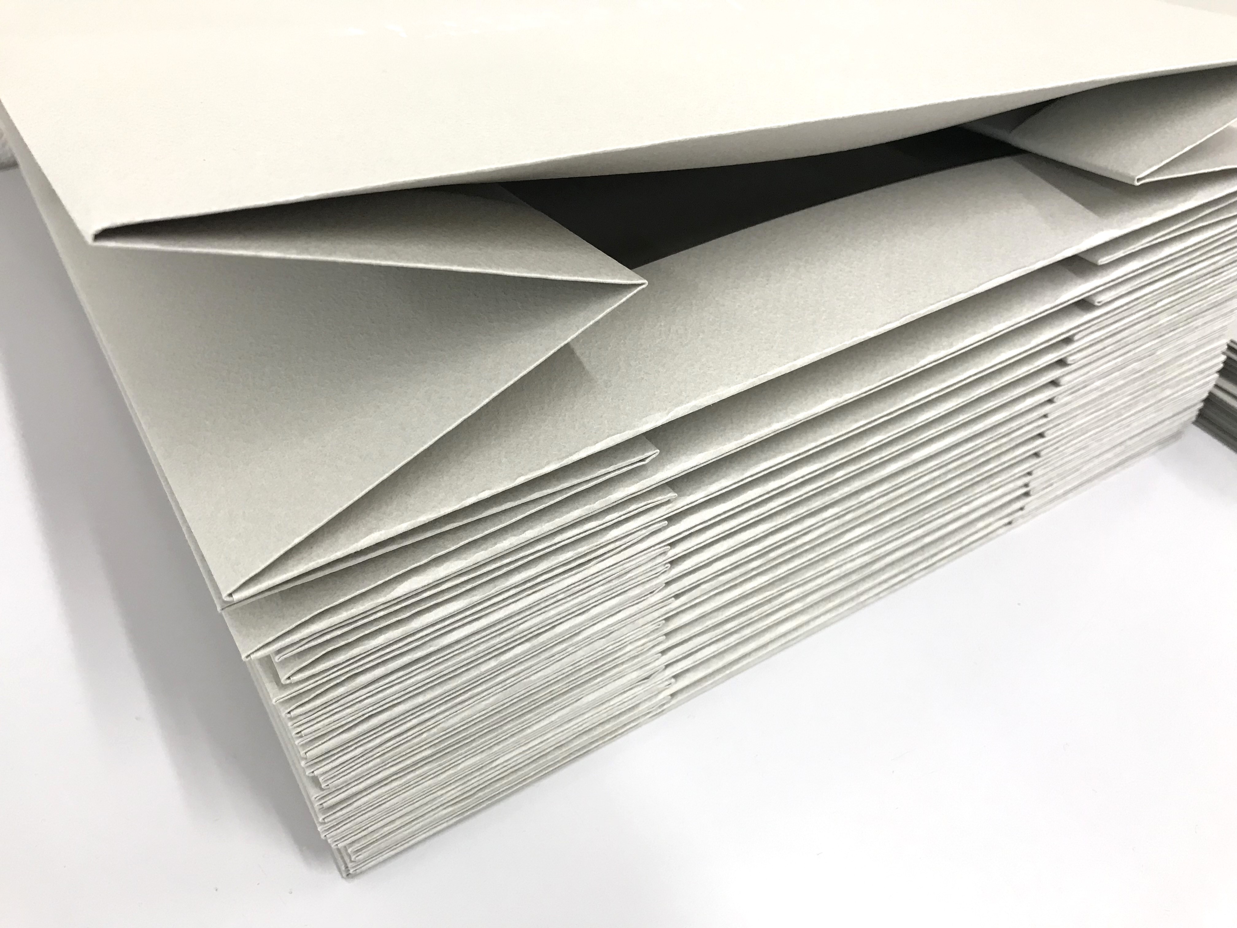エンボス加工の紙は厚みがあり折り後も反発が強いため上に重しを置く時間を多めにとるなど様子を見ながらの作業が続きます。