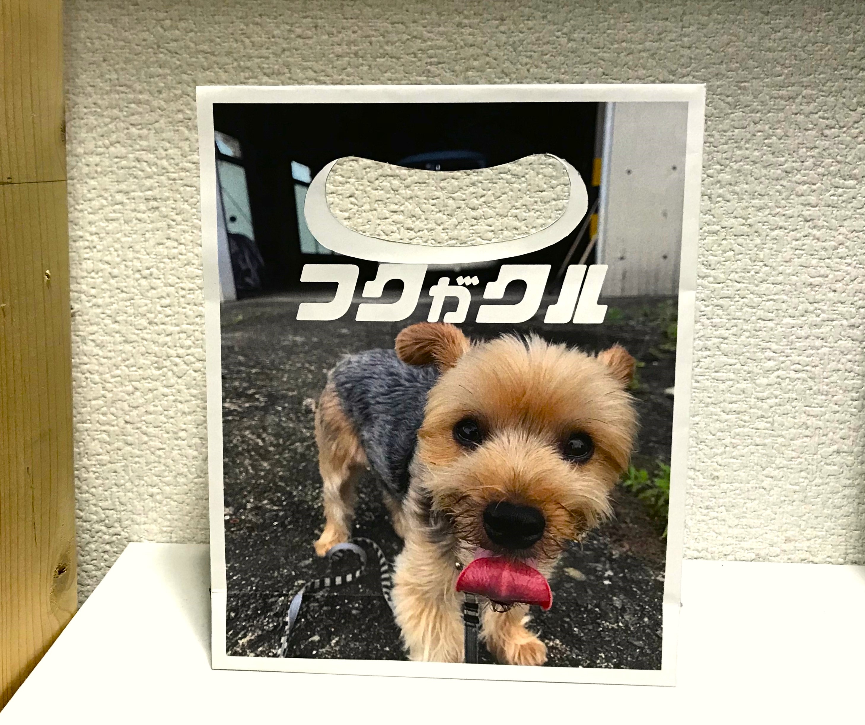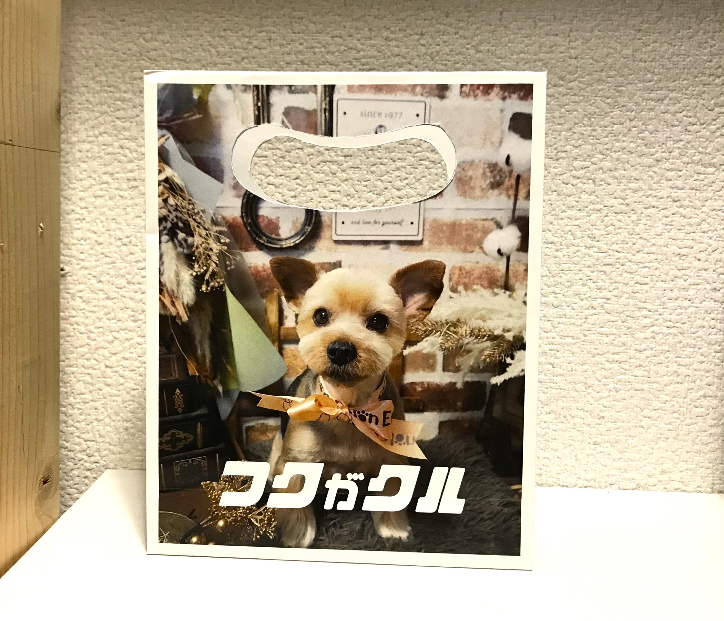 こんにちは!まっつんです 会社の2階へ上がる階段踊り場に くま袋で製袋した製品を展示しています🎵 その中に、ひと際目を引くかわいい袋が! ↑ 表面 『フクがクル』 ↑ 裏面 『フクがクル』 会長の愛犬フクちゃんの袋です! 手持ちのところは持ちやすいカーブを付けて抜いています。 かわいいペットや家族の写真で作る袋もいいですね! 記念品としていかがでしょうか😊