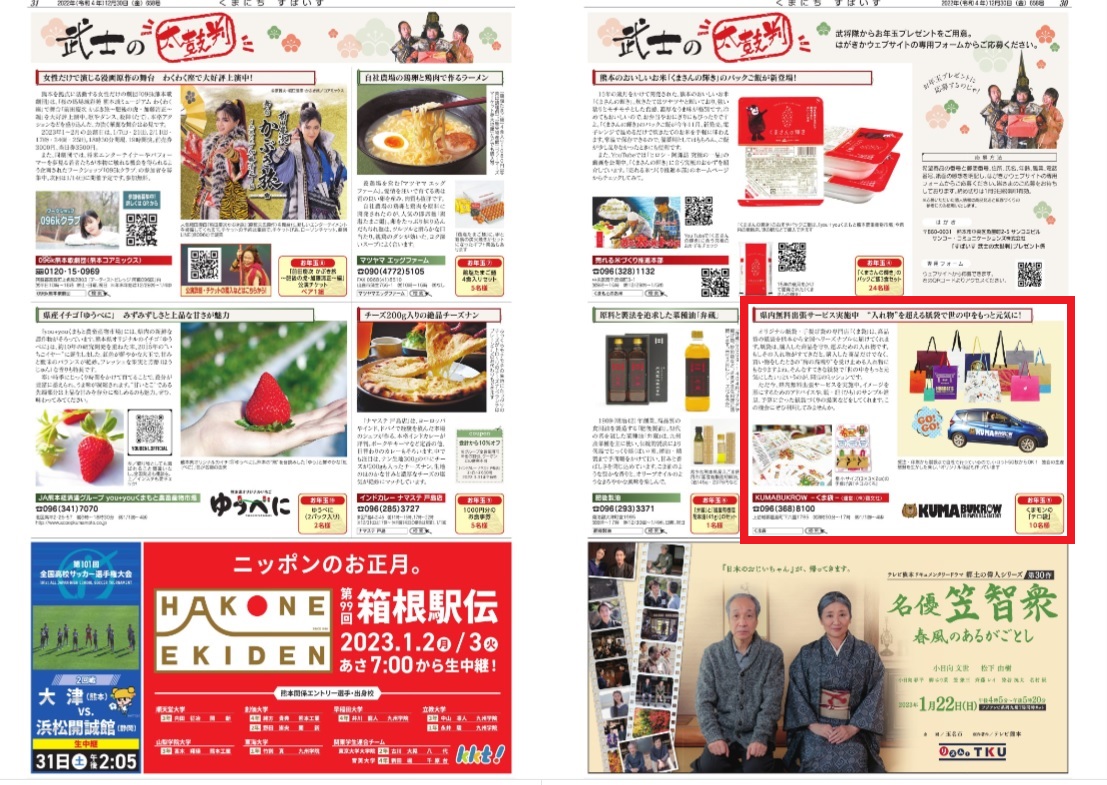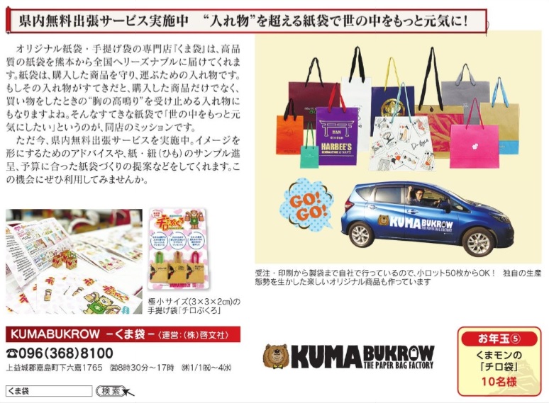 こんにちは!まっつんです 今年もどうぞよろしくお願いいたします🎵 くま袋では今日もせっせと愛情こめて袋をお作りしております。 熊本市を中心に配布されているフリーペーパー 「くまにち すぱいす」の最新号に弊社のお年玉企画広告を掲載しました! お年玉は チロ袋 (3セット) を10名様に!! ご希望の方は是非、すぱいすさんにお問合せください(^▽^)/