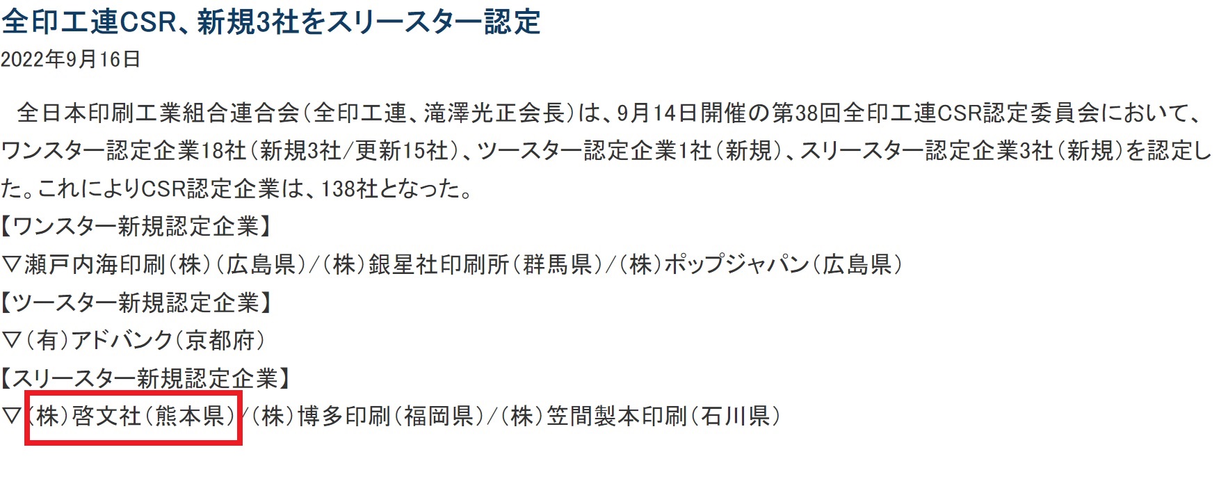 今回、最高位のスリースターに認定された企業は全国で12社。