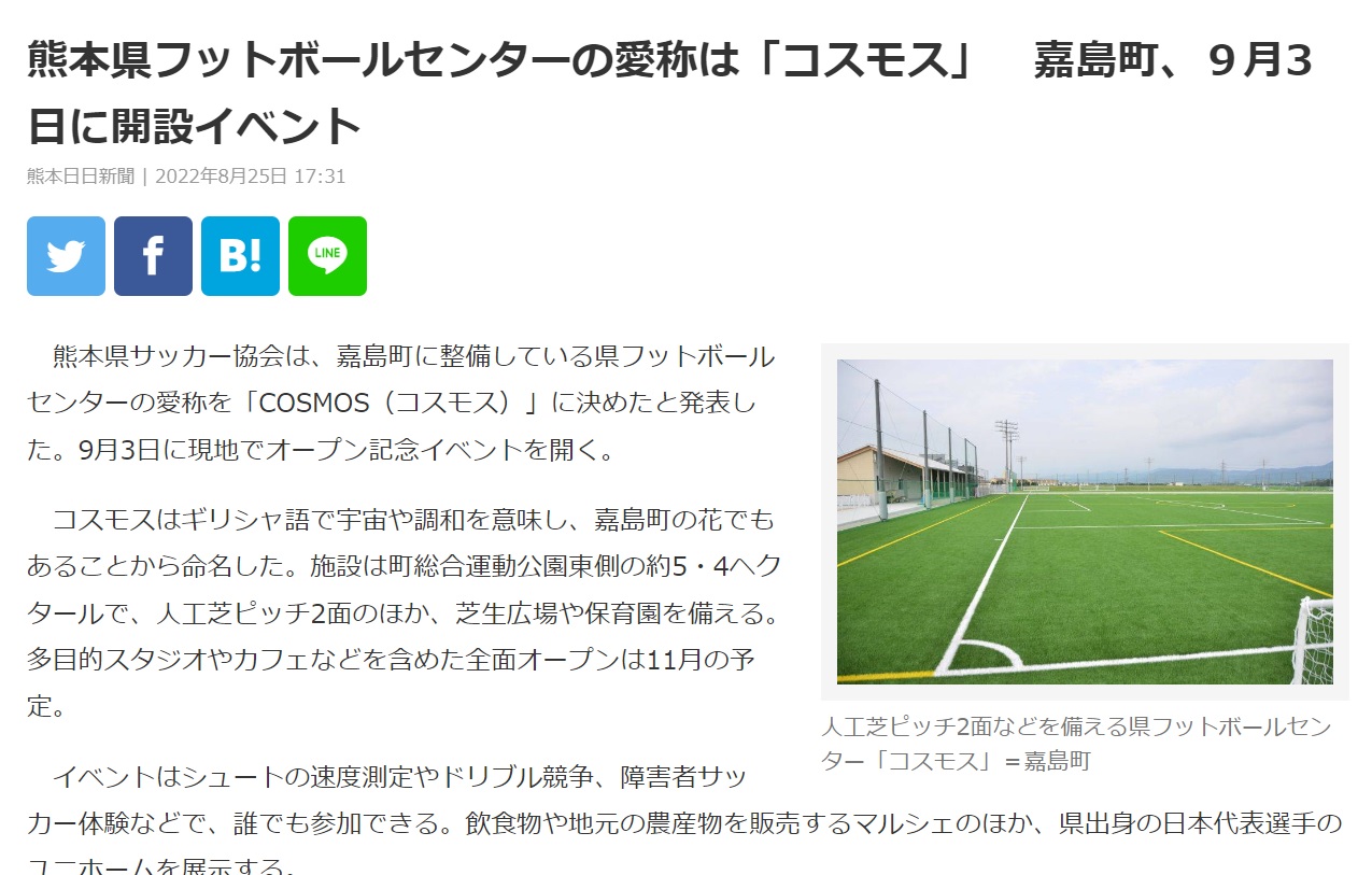 こんにちは!まっつんです 我が嘉島町にまた新たなるサッカー施設その名も 『COSMOS』がついに完成です!! (熊本日日新聞より) こちらは一般社団法人熊本県サッカー協会が数年前から整備を進めていたグラウンドで、明日9月3日㈯にオープン記念イベントが開催されます! 熊本県フットボールセンター「COSMOS」オープン記念イベント 【KFC PR動画】熊本県フットボールセンター工事の状況 ↑着工からの様子が動画でも見ることができますよ♪ 興味があられる方はチェックしてみてくださいね(^▽^)/
