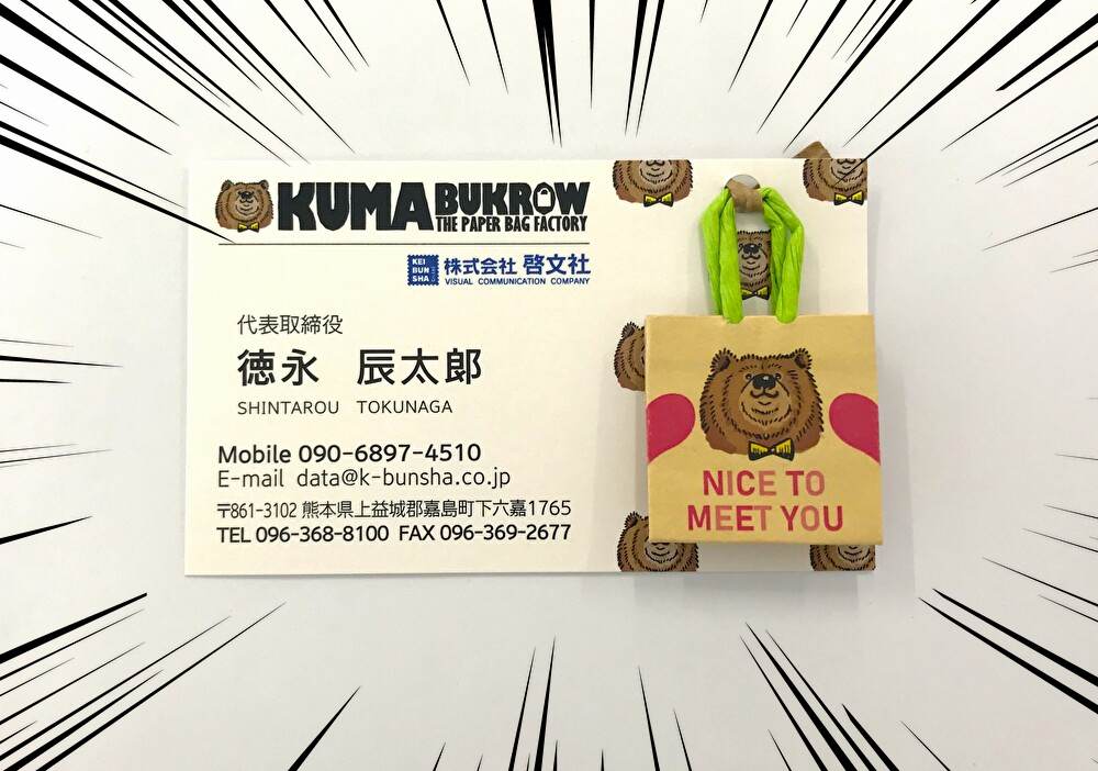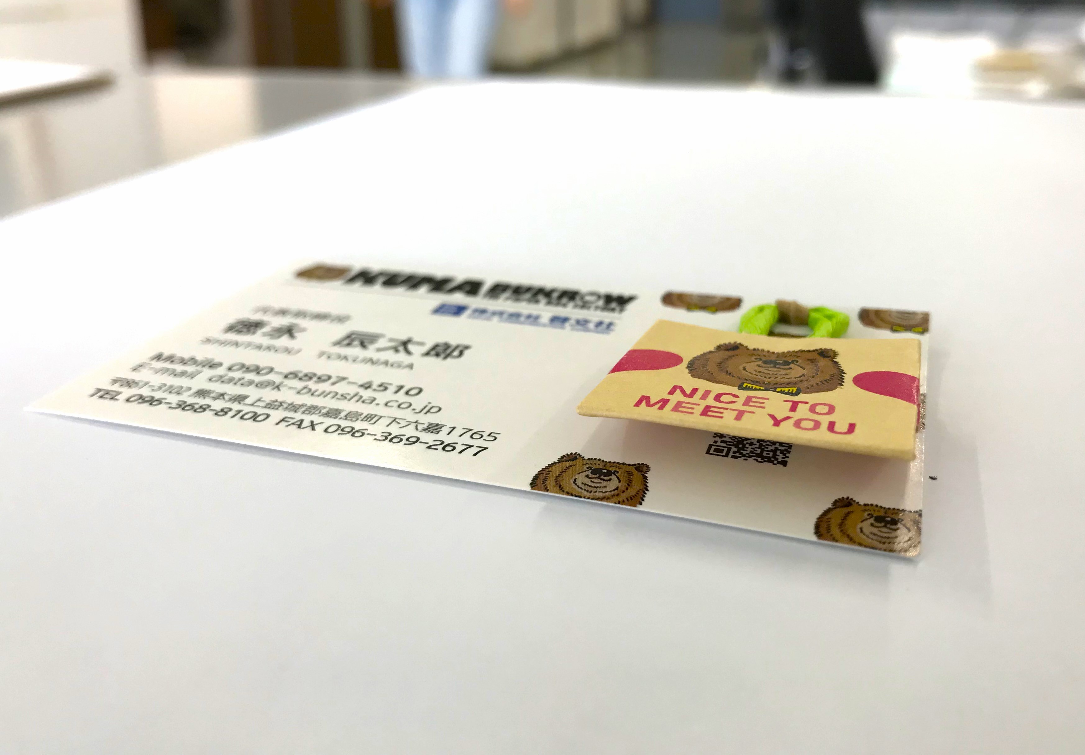 こんにちは!まっつんです くま袋🐻社長の名刺から 何やら飛び出しているとの情報が入りました!! バーーーーン!!! 何かと思えば小さな紙袋がぶらさがってるやないかーーーい(;’∀’) その名も弊社商品『チロ袋』をくっつけてみました💛 取り外してちゃんと物が収納できる、業界最小かもしれない紙袋です!! 今日も来訪された女性のお取引様から「かわぃぃ🥰」をいただきました(^^♪