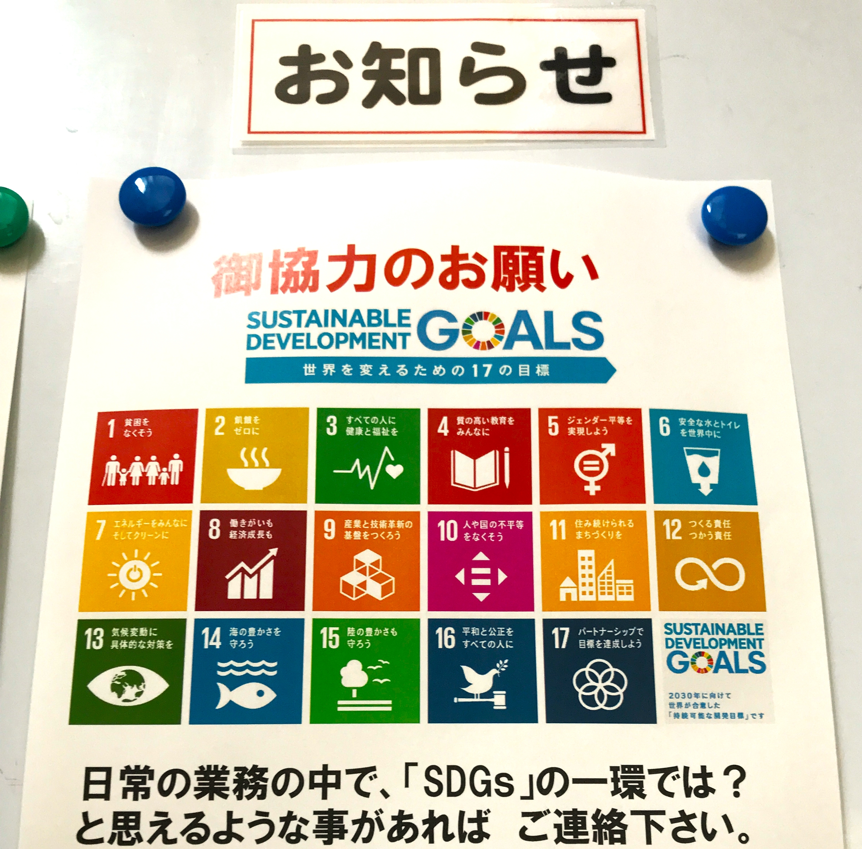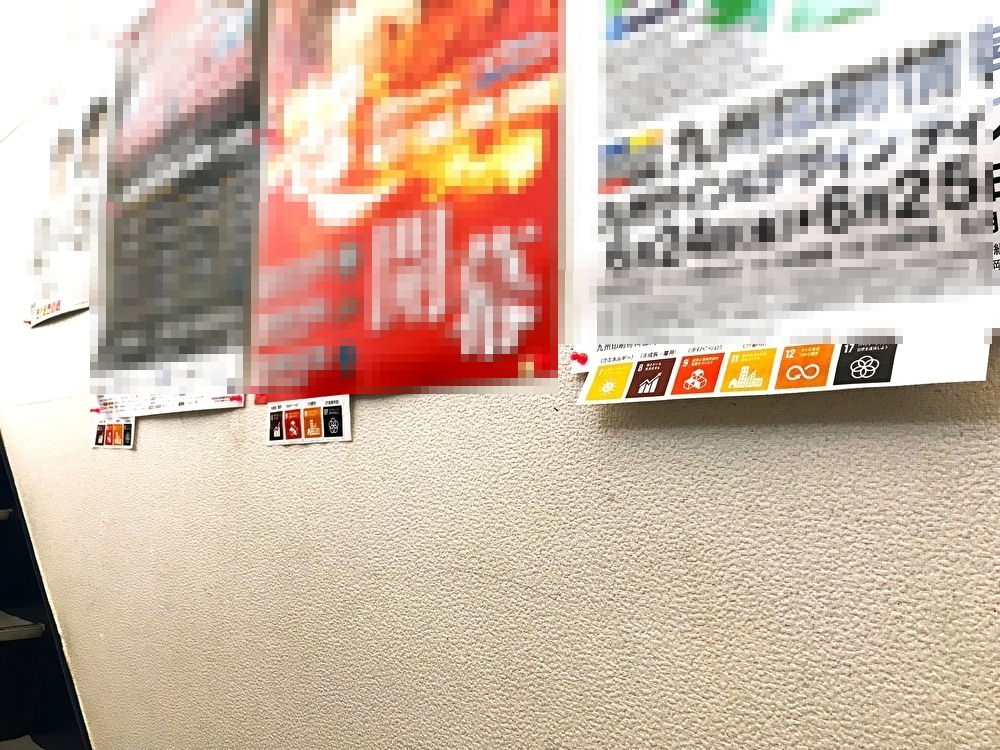 社内掲示物の下には該当するアイコンを表記させ「SDGs」について社員の理解や行動を促すよう努めています。