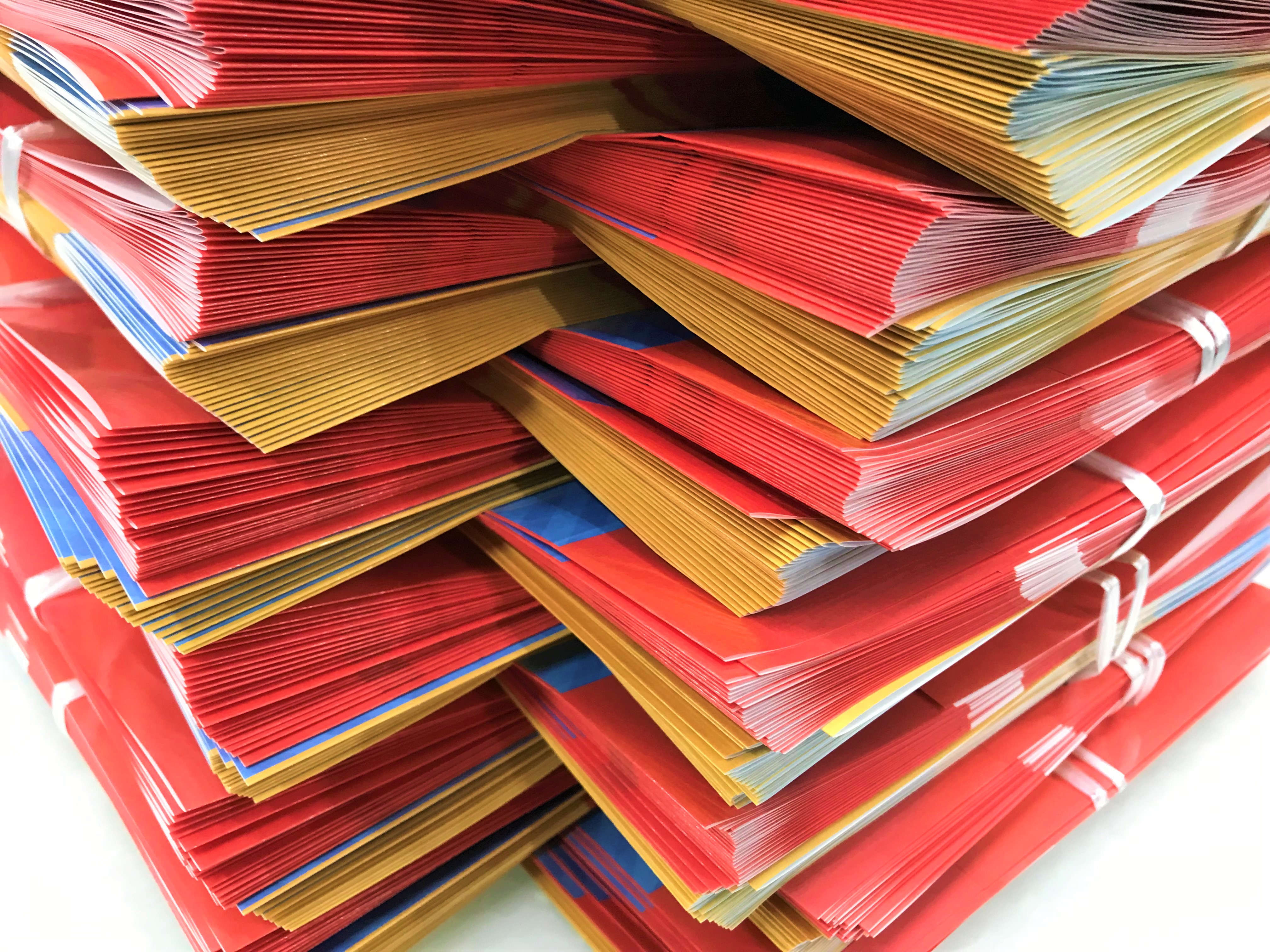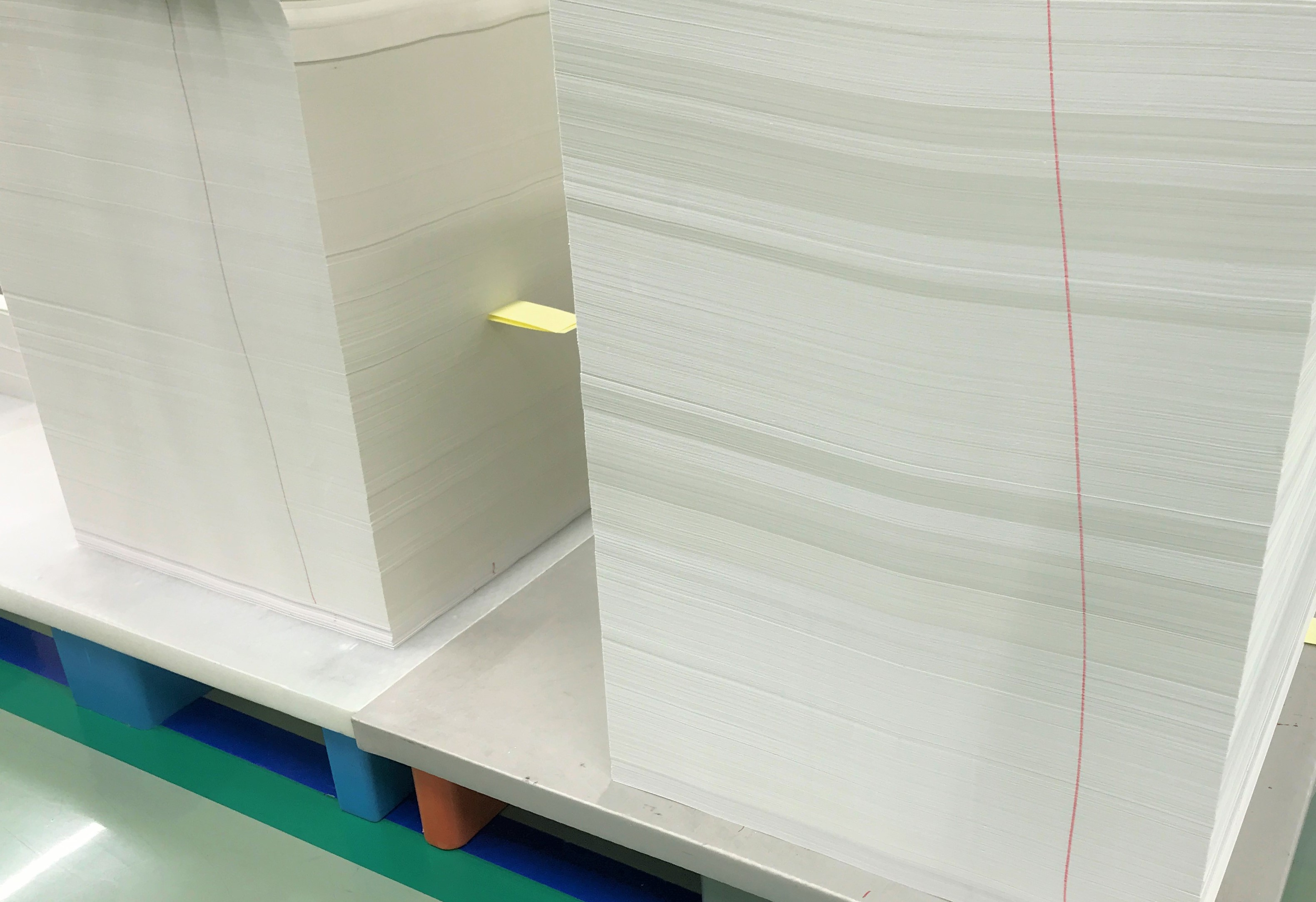 こちらもリピートのお客様です。オリジナルブランドを立ち上げていらっしゃる老舗店。サイズは2パターンお作りしています。千単位のご注文ですので紙タワーができております🏢