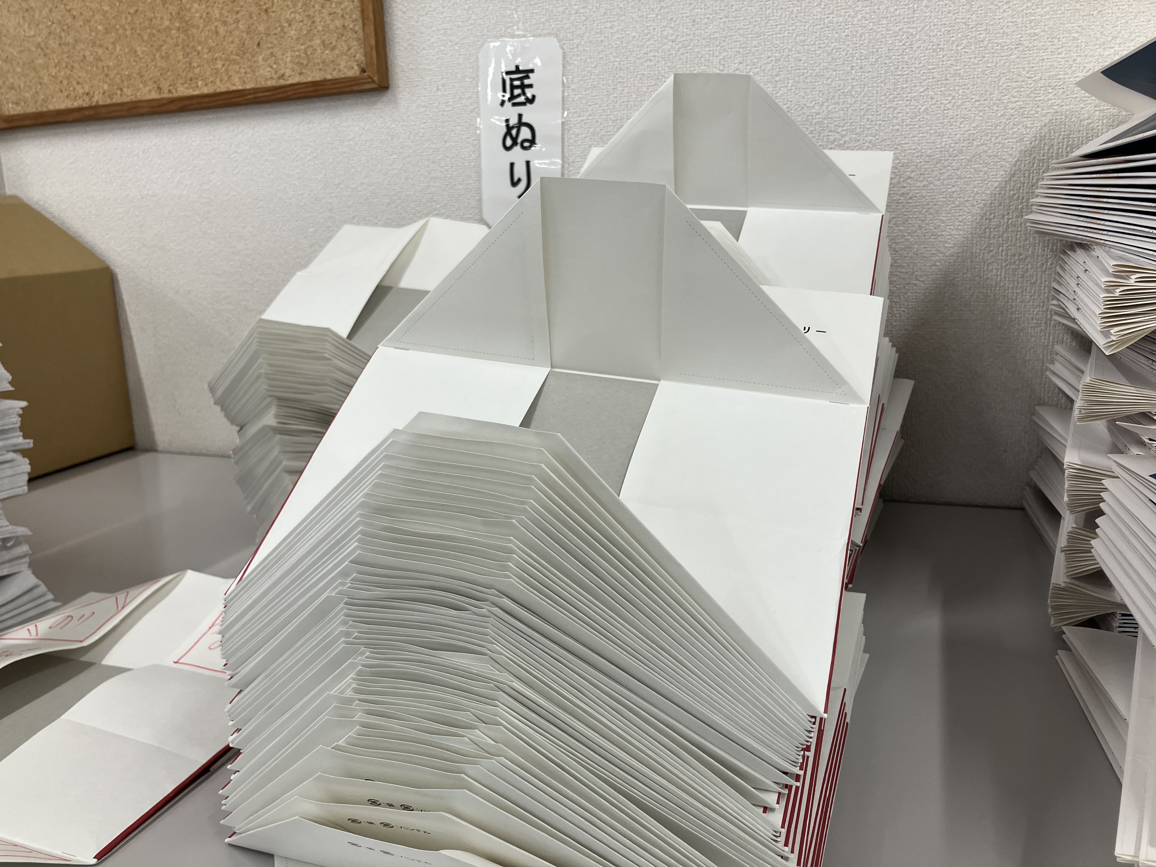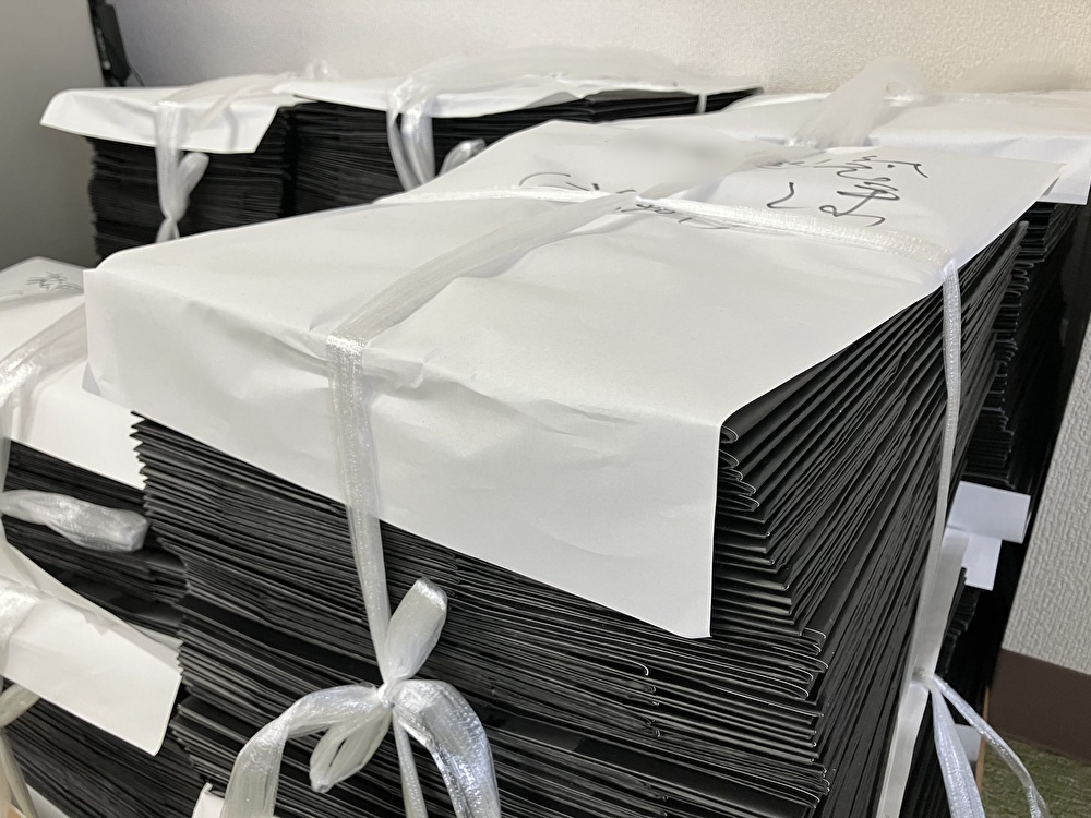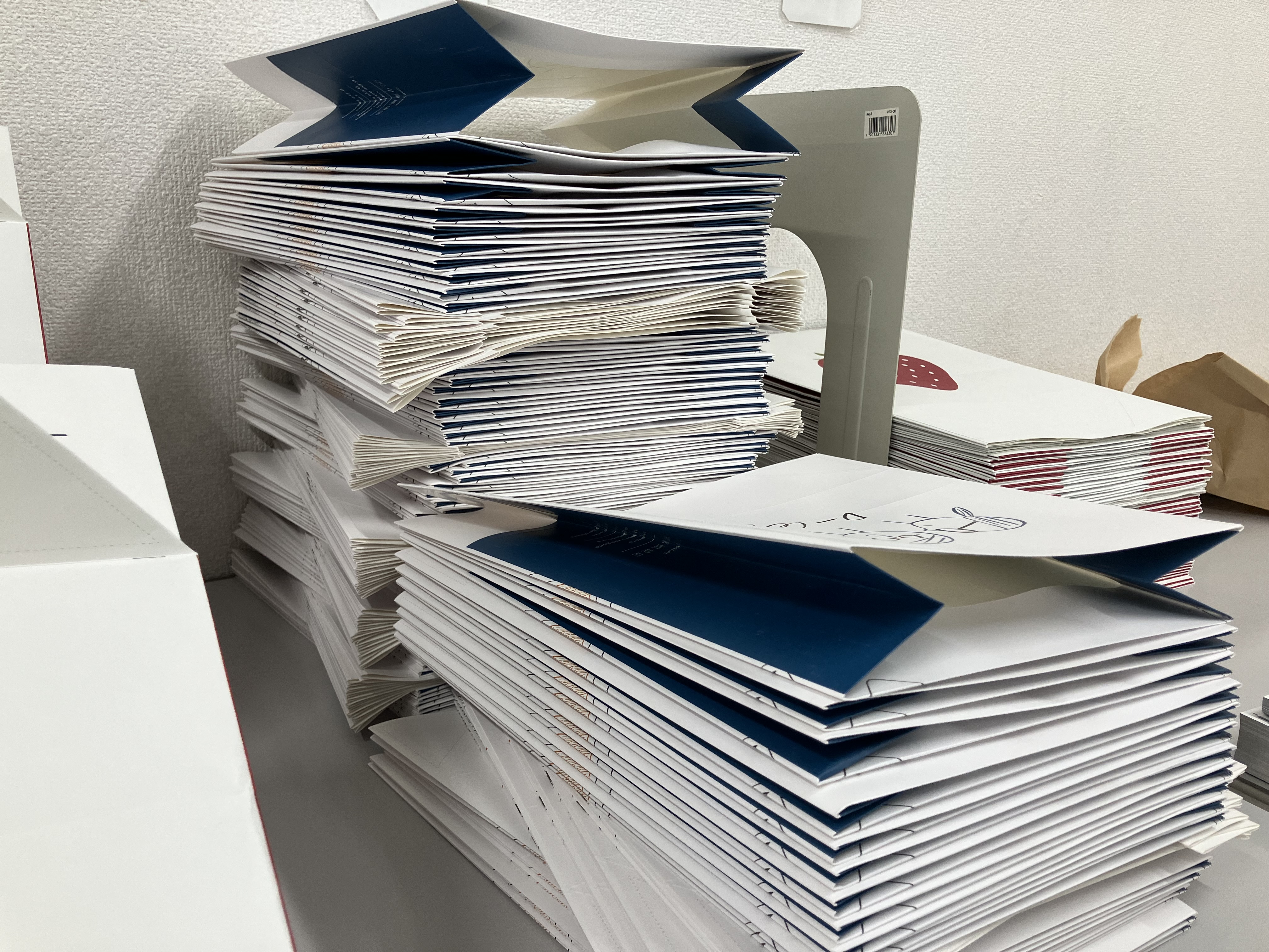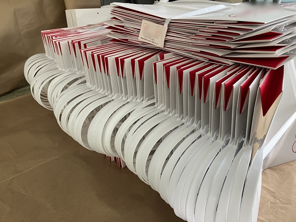こんにちは!まっつんです ついに一昨日、熊本県がサクラ開花宣言です! 高知県と並んで全国で一番乗りだそうです(^▽^)/ 週末に熊本県南地域を移動する機会があったのですが山にはチラホラほのかなピンクに色づいた桜の木を見ることができました。 近所の木はまだ一割も咲いていませんが今週でだいぶ開花しそうです!! さて今日もいろいろな手提げ袋が作業場に並んでいます!