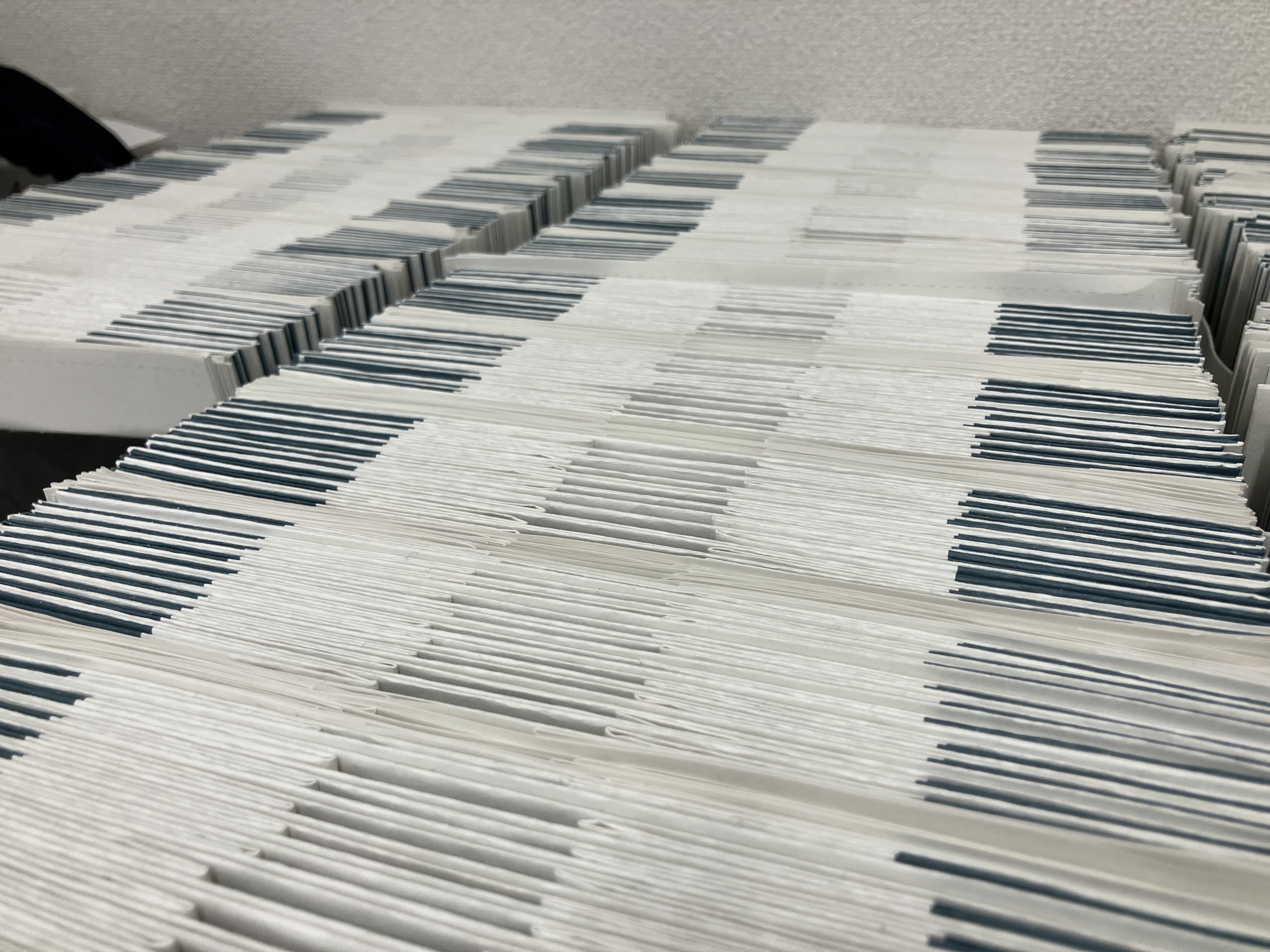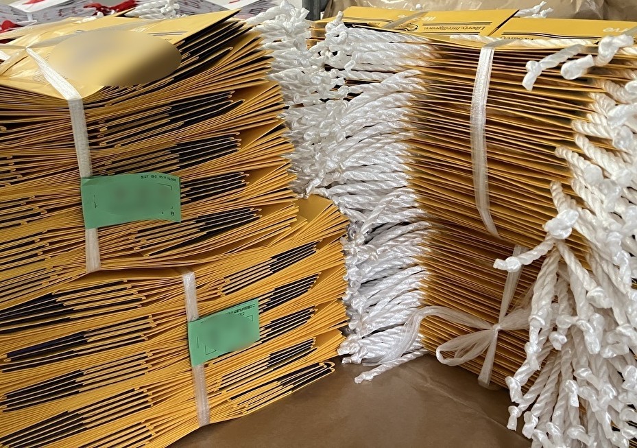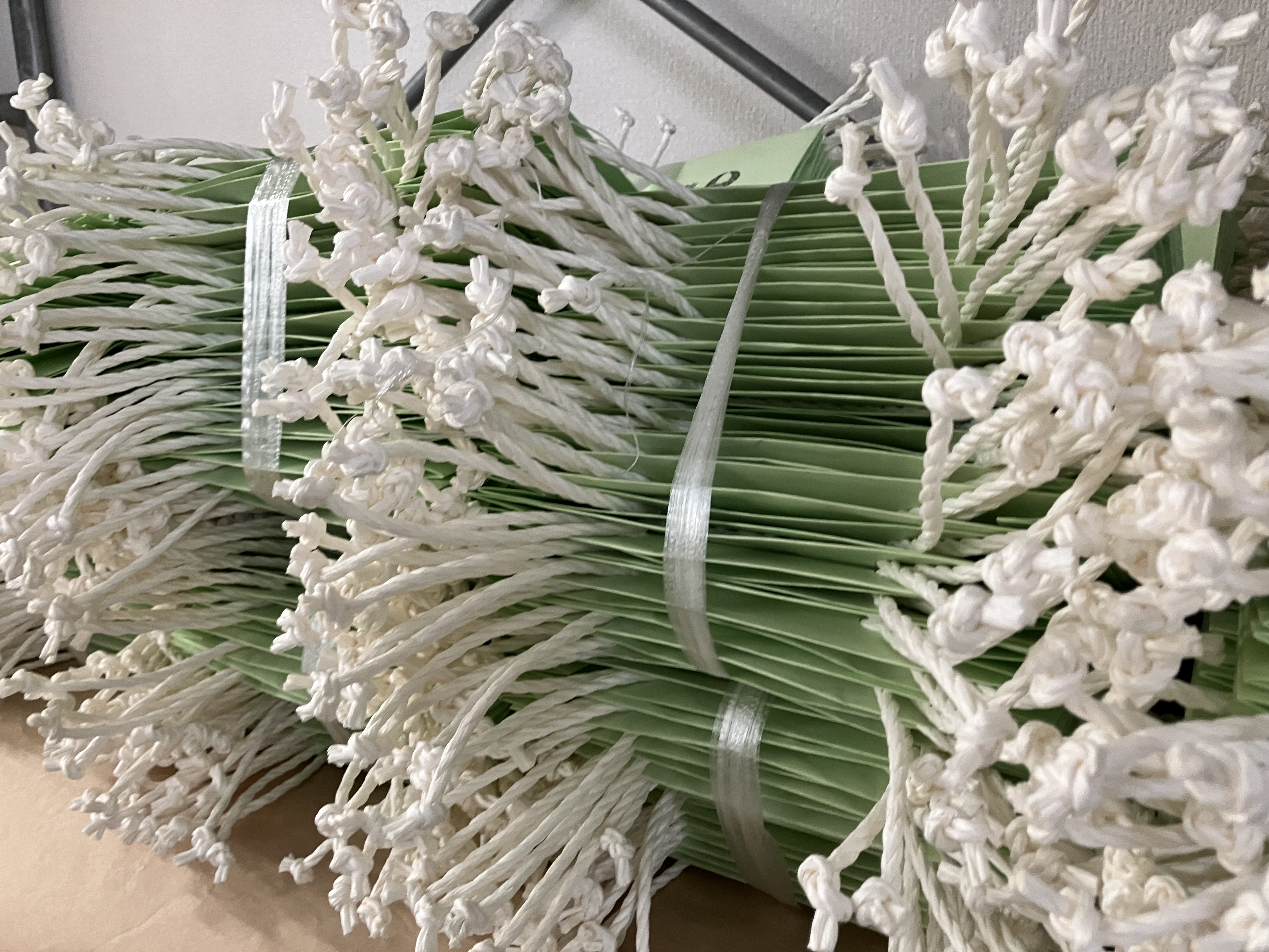 こんにちは!まっつんです ついに一昨日、熊本県がサクラ開花宣言です! 高知県と並んで全国で一番乗りだそうです(^▽^)/ 週末に熊本県南地域を移動する機会があったのですが山にはチラホラほのかなピンクに色づいた桜の木を見ることができました。 近所の木はまだ一割も咲いていませんが今週でだいぶ開花しそうです!! さて今日もいろいろな手提げ袋が作業場に並んでいます!