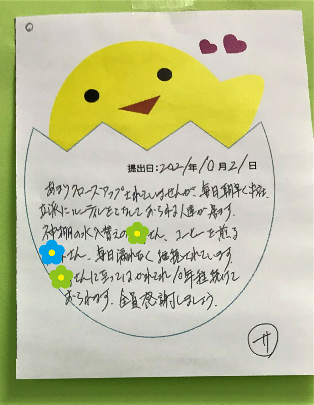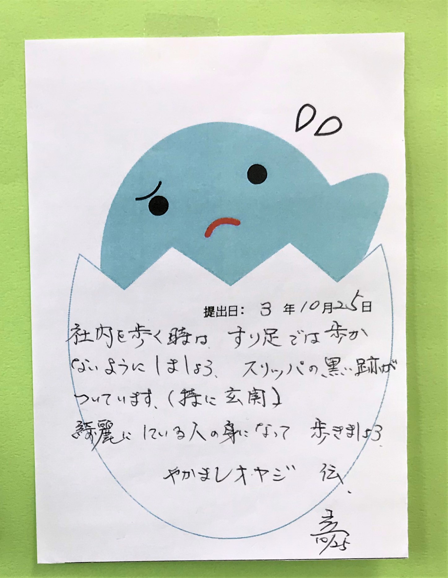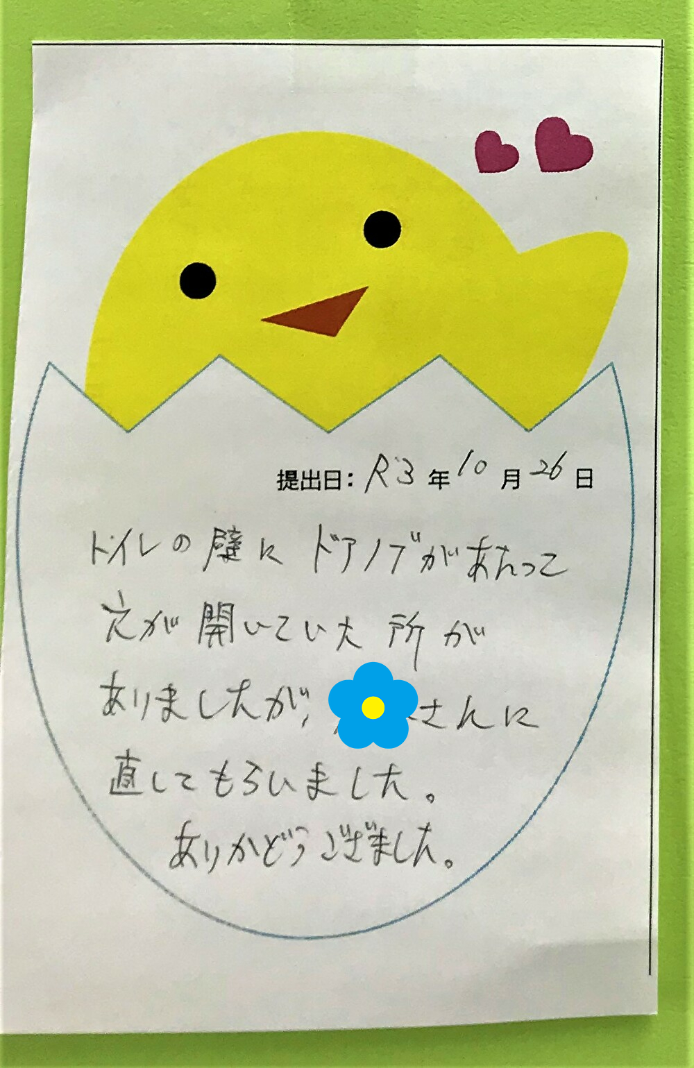こんにちは!まっつんです 一日の寒暖差で体調を崩す方増えてますね。 寒い!と感じたらガンマンせずに1枚、衣類を重ねましょう。 その暖房は本当に必要ですか? 重ね着することで体は結構温まります💛 重ね着は🥰ECO🥰 話題は変わって先月にスタッフから集めたご意見 通称「たまちゃん」の一部をご紹介します。 今月もたくさん集まりました! 互いに理解し合い、問題点・伸ばす点を把握し快適な会社を みんなで作っていきましょう!