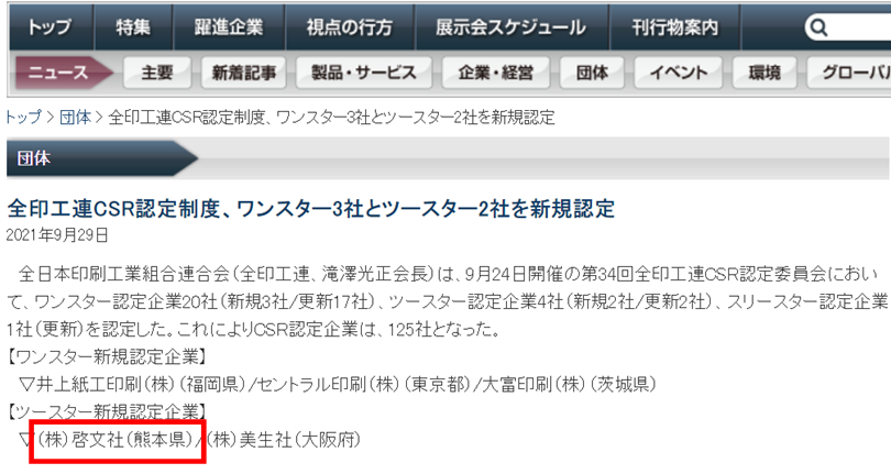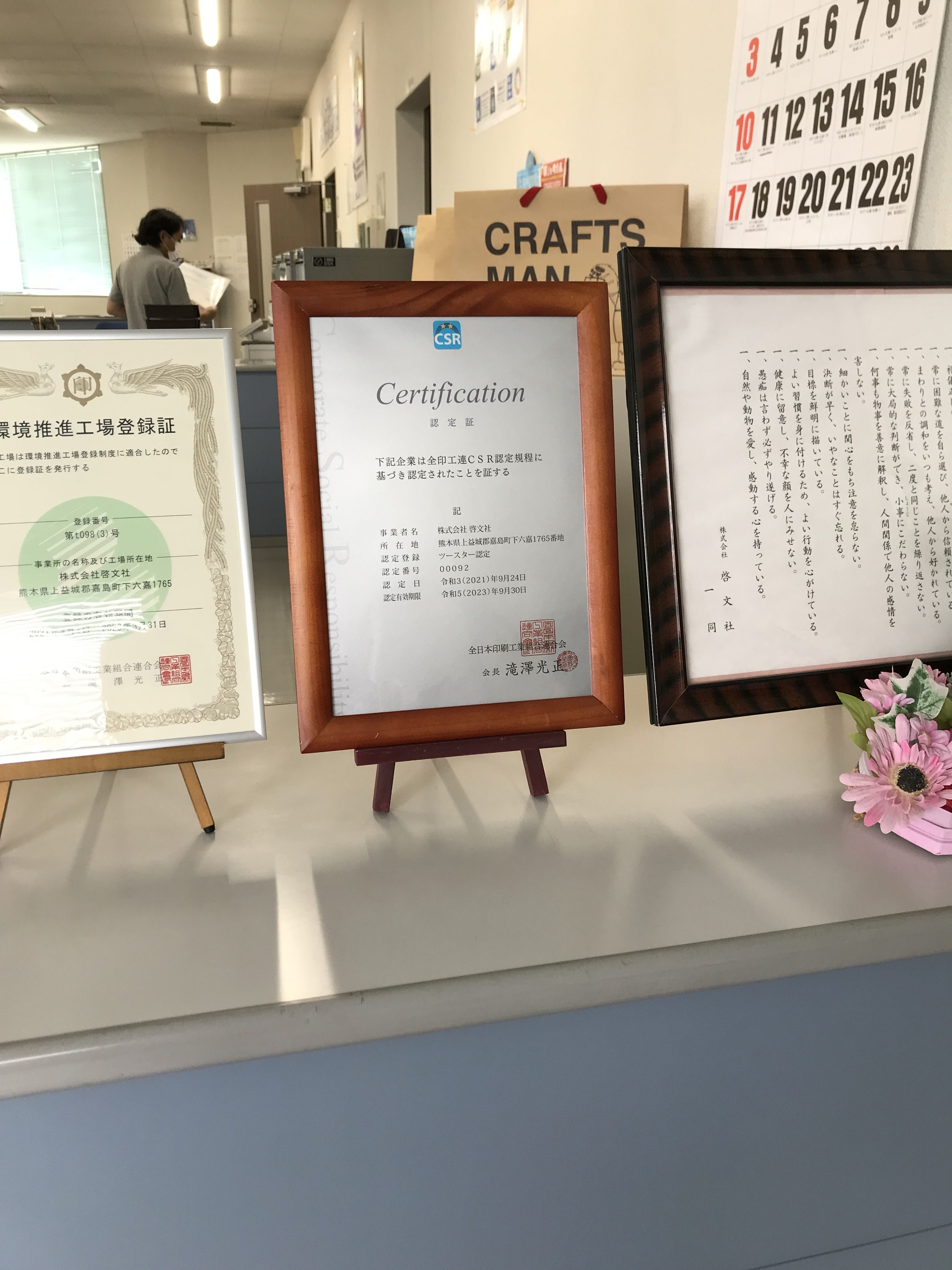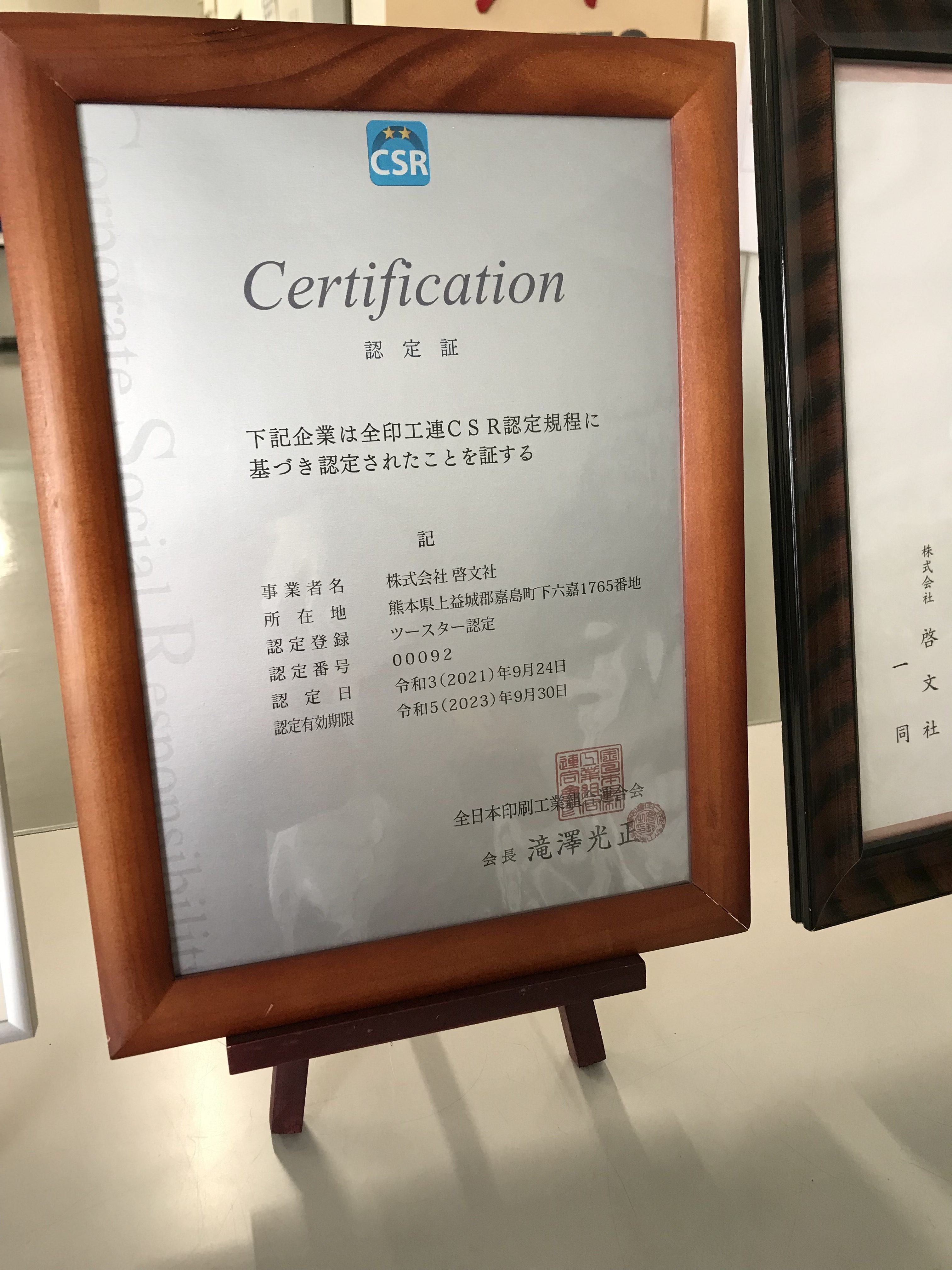 CSR認定制度とは、中小印刷業が取り組むCSR(企業の社会的責任)への取り組みを「コンプライアンス」「環境」「情報セキュリティ」「品質」「雇用・労働安全」「財務・業績」「社会貢献・地域指向」「情報開示・コミュニケーション」という8つの分野に絞り、策定されたチェックリストに基づいてその達成度を認定されたものです。