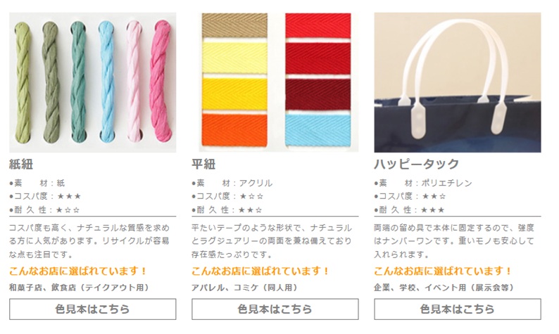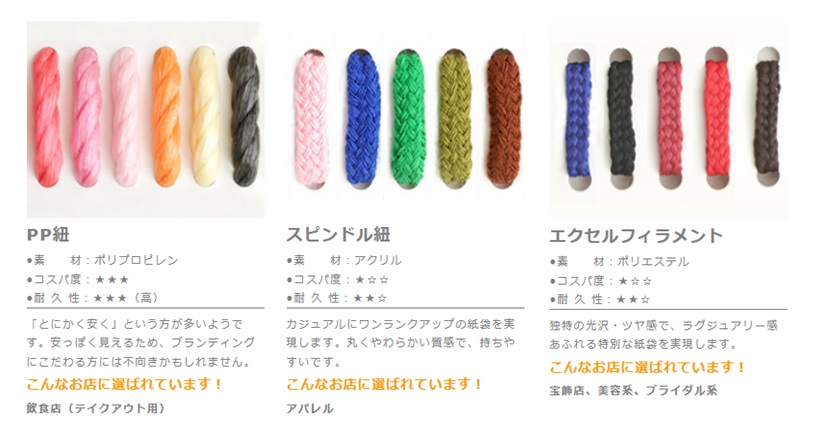 くま袋でお取り扱いしている規格品の紐の種類は6パターンです。