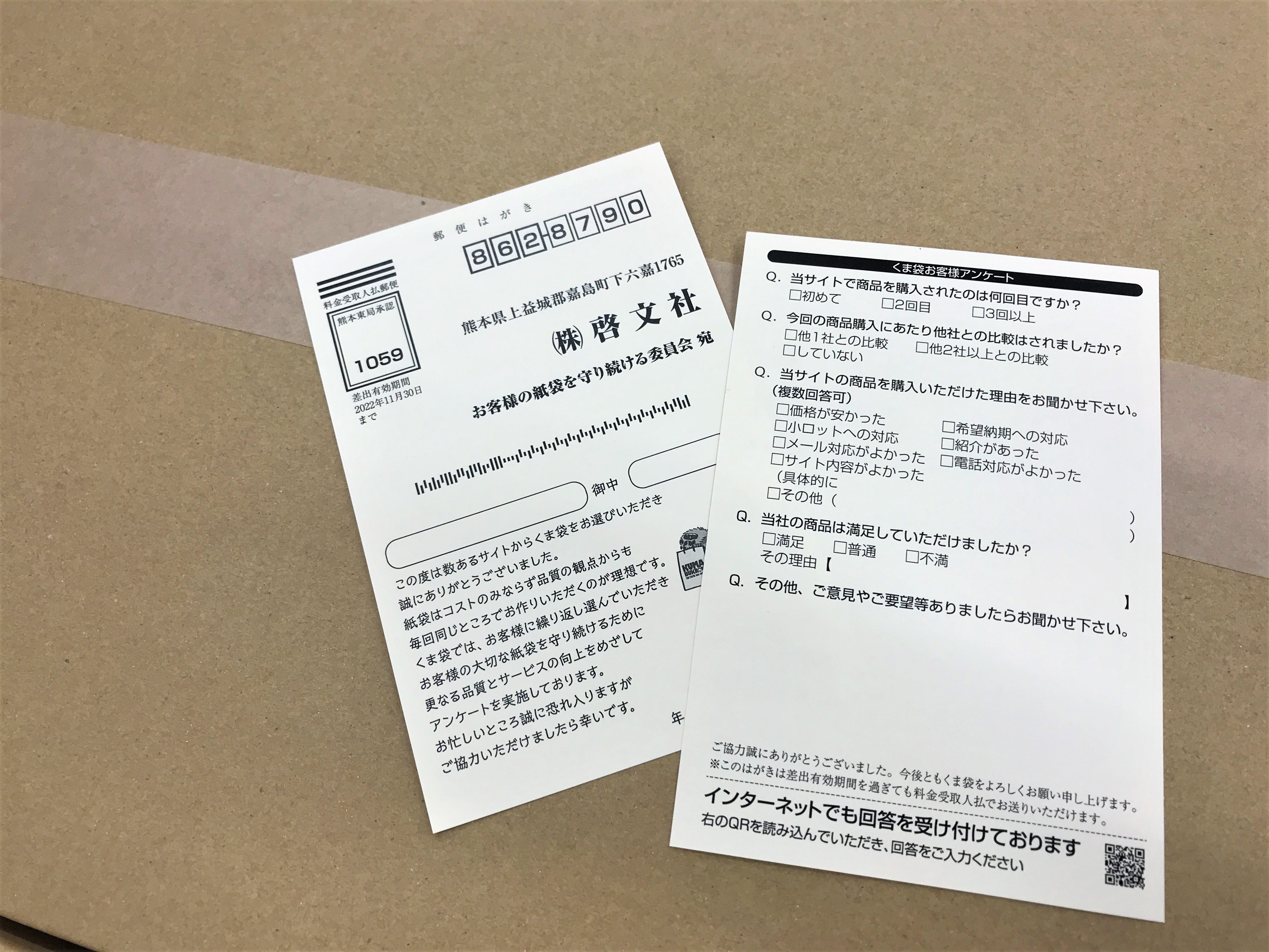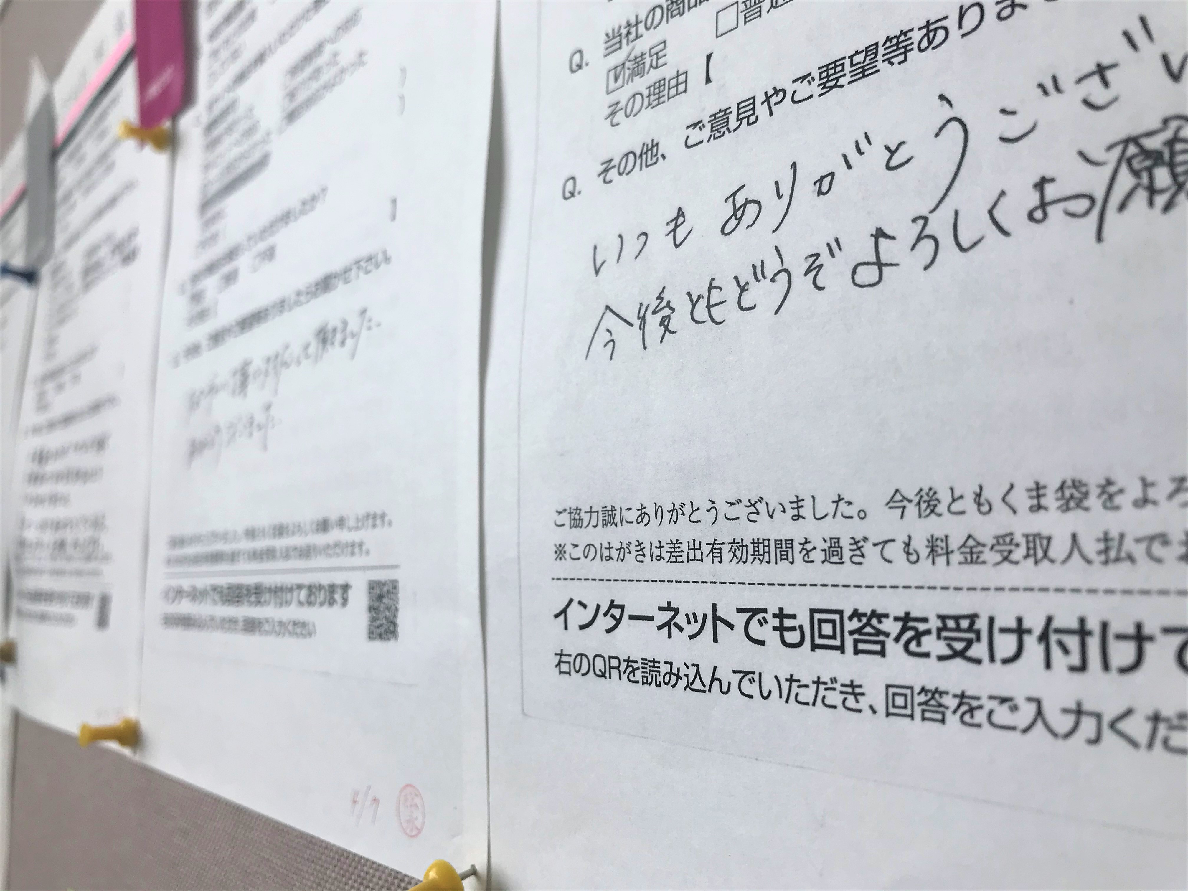くま袋では完成した製品と一緒にアンケートハガキを同梱させていただいております。