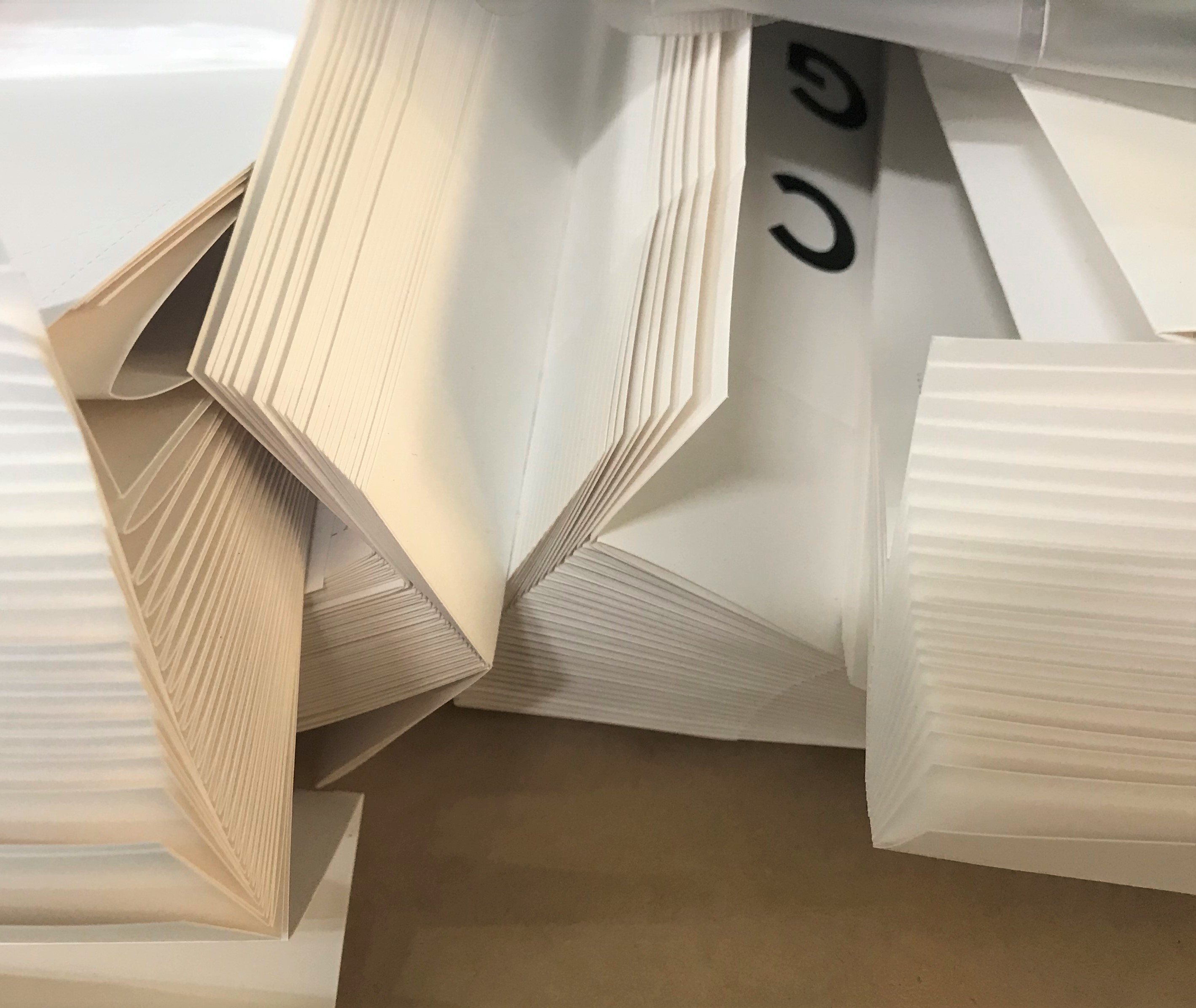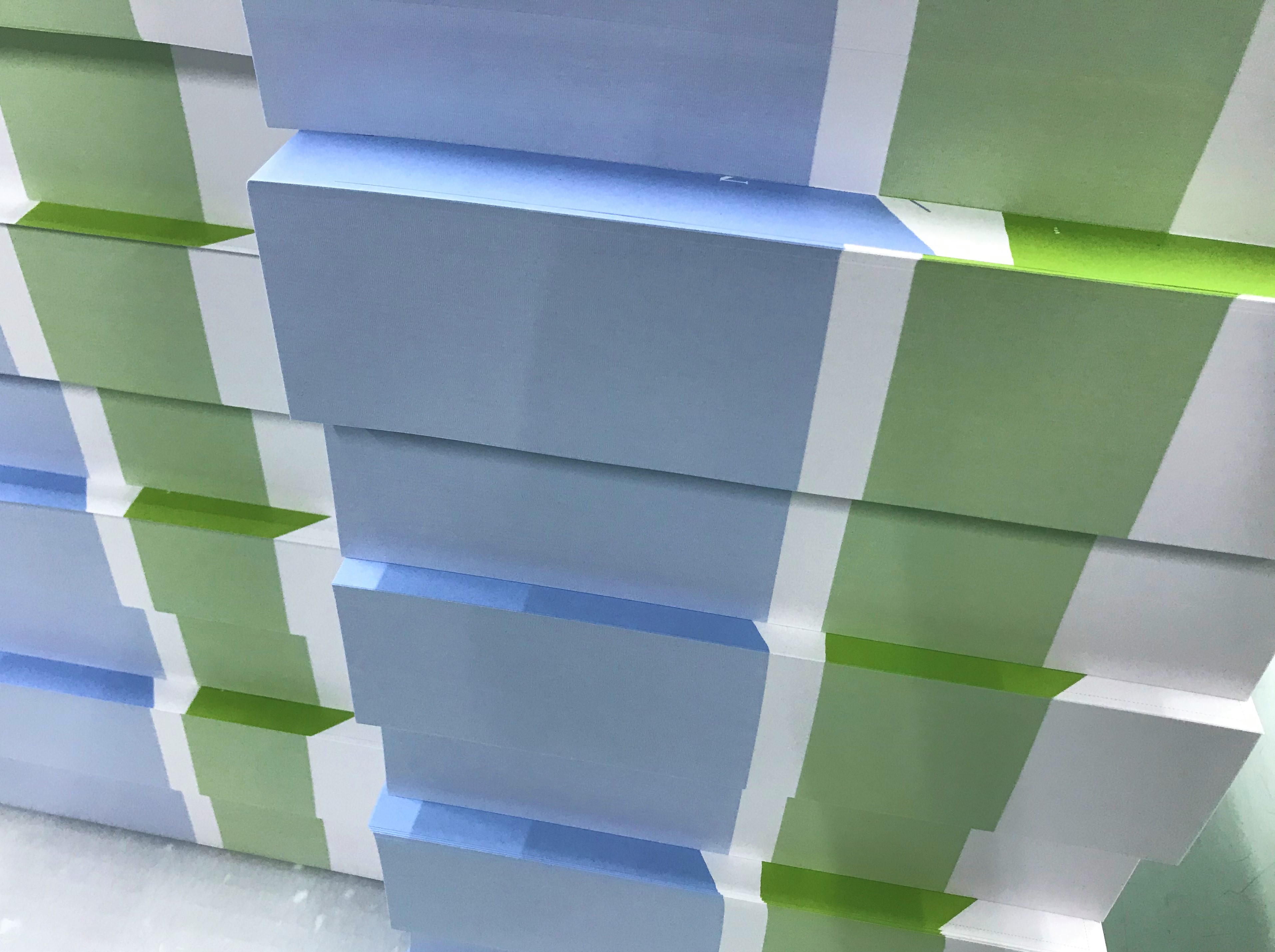 まだ折り目を入れていない状態です。全面に色を乗せているため乾くまでベンチタイム。今は旅行に出られませんが、この空色と草原の緑色が見ているだけで行った気分にさせてくれます♪