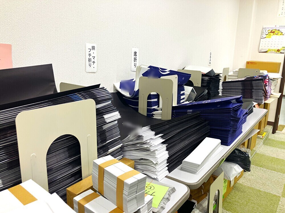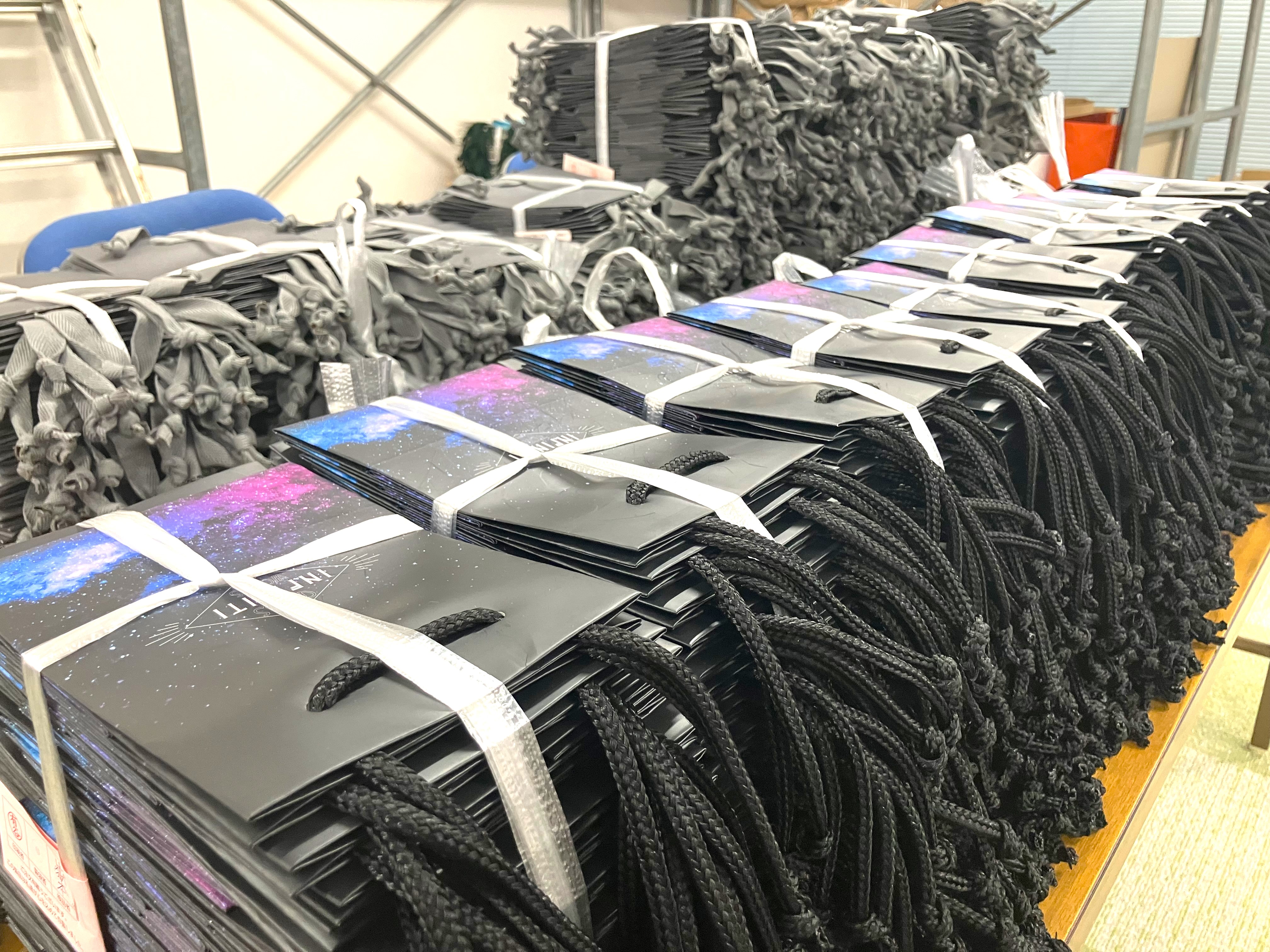 こんにちは!まっつんです 年末からご注文いただいてる袋の数々を現在バンバン製袋してるとことです! くま袋では小ロットを得意としていますので作業場に並んでいる袋は多種多様です。 口、底に使用する厚紙のパーツもその袋のサイズによって違いますので他の袋と混同しないように整理整頓が重要です! こちらは紐付けまで終わり検品を待っている状態です。 剥がれ、汚れ、シワはないか。紐はしっかり通してあり、長さに違いはないか。紐の結び目にばらつきがないかなど、しっかり人の目で確認していきます!