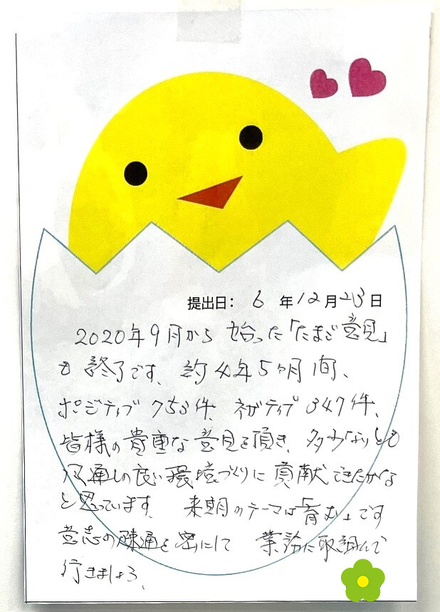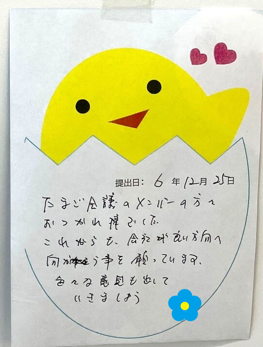 こんにちは!まっつんです 毎月、全社員の意見を徴収し快適な会社運営に寄与するのが目的で実施してきた🙂スタッフとのバーチャル意見交換の場 その名も『たまちゃん』 2024年をもって完結しました!! 最後の投稿の中から一部ご紹介します(^▽^)/ はい!2025年もスタッフ間の風通しがよくなる企画を考えていきたいと思います💗