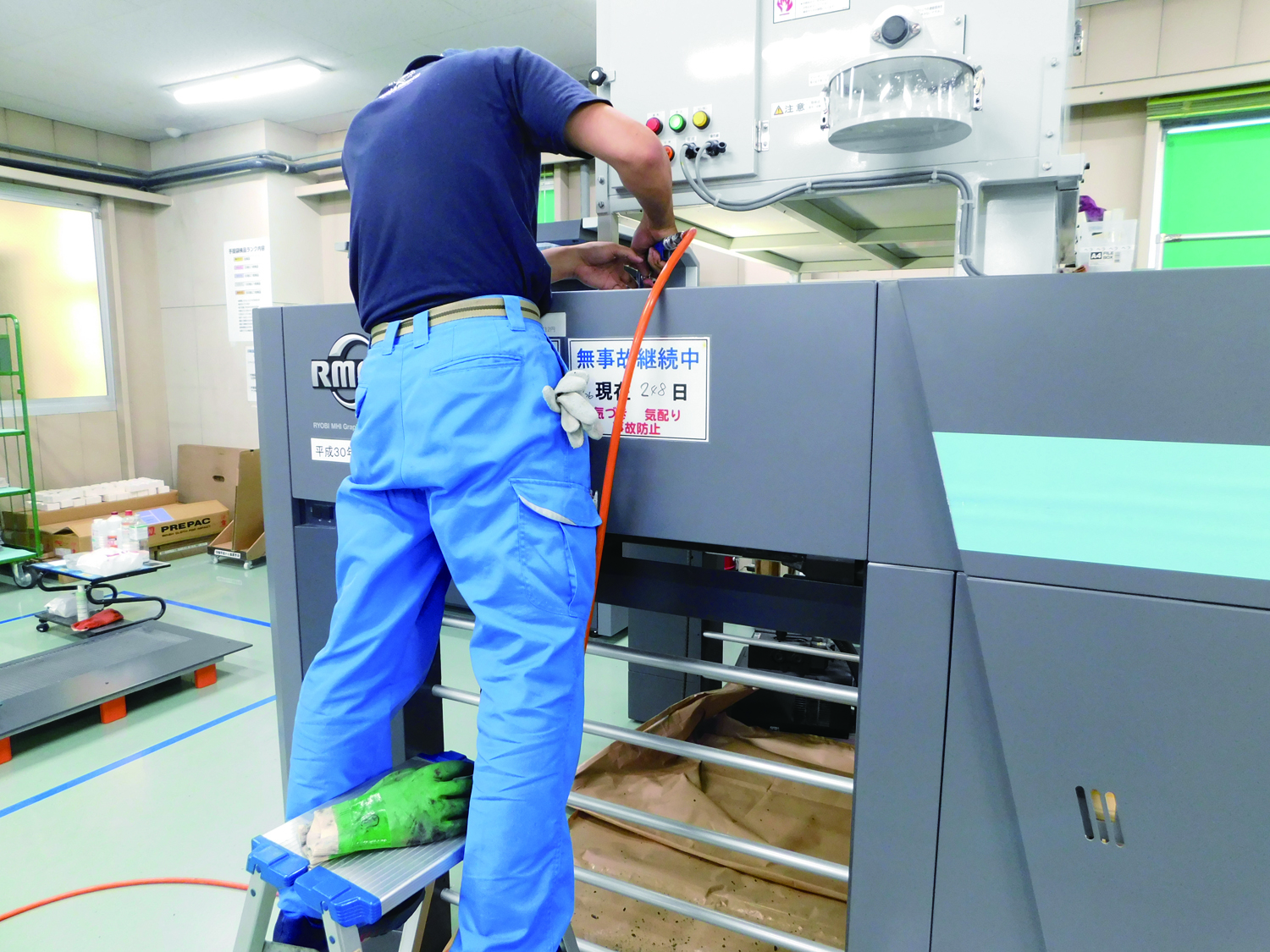 1階工場ではエアーを使用しての機械清掃が行われました。