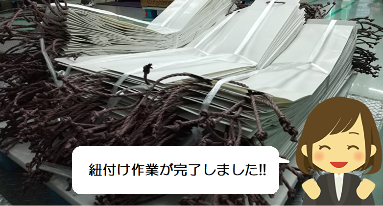 縦長の手提袋の紐付け作業が完了したのでご報告です!
