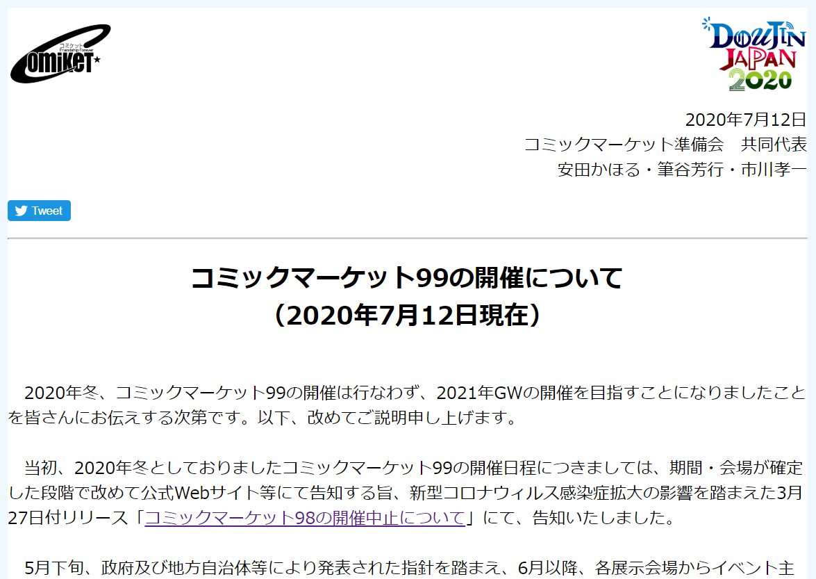 今年の冬のコミケ延期のお知らせもありましたね。