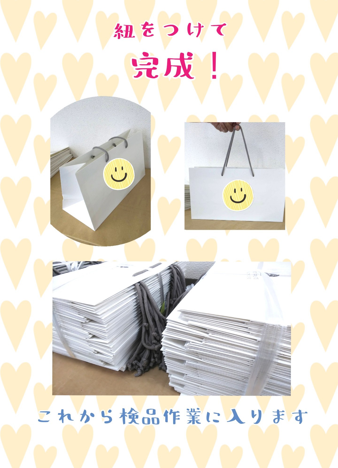 前回ブログデビューした ミーたんです♪ 製袋作業のようす ☝こちらに引き続き 今回は、 紐を取り付けた状態のお写真を! ❀仕様❀ お客様:日本初出店の飲食店様 紙質:片ツヤ晒クラフト PP加工:なし 紐:アクリル丸ひも 紐の色:33ワームグレー これから、検品作業に入ります! その後、梱包→発送です♪ お客様のもとに届くまであと少し!