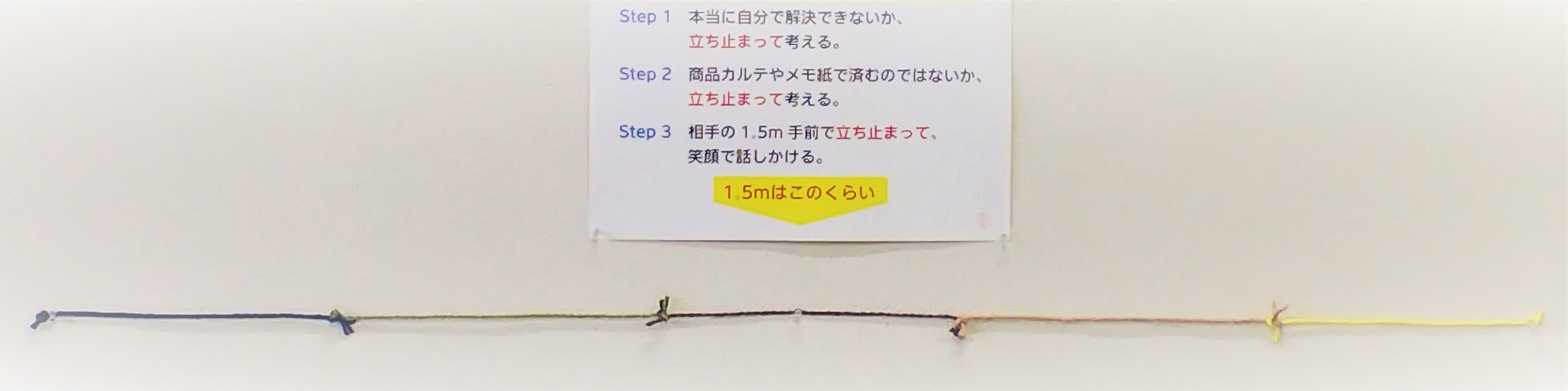 この貼り紙の下に貼られている紐の長さが約1.5m。