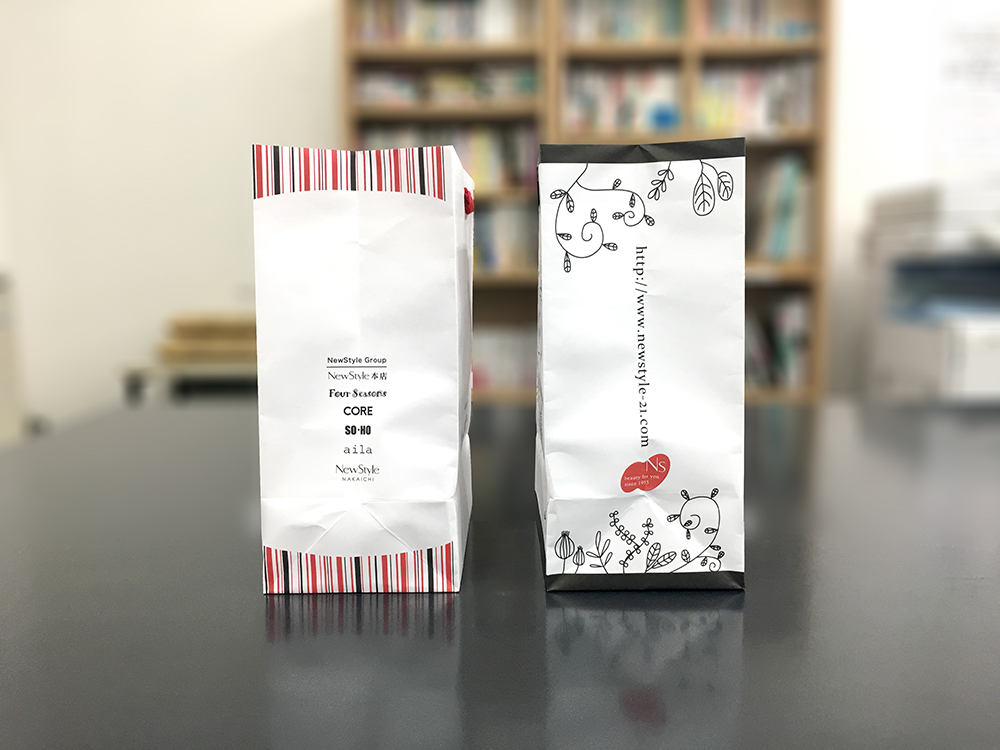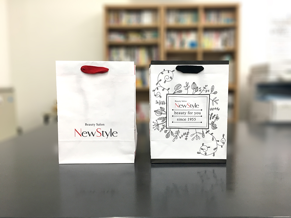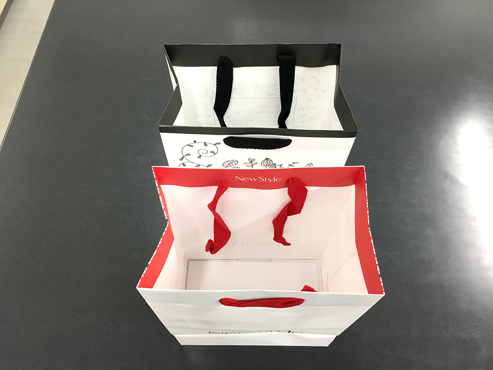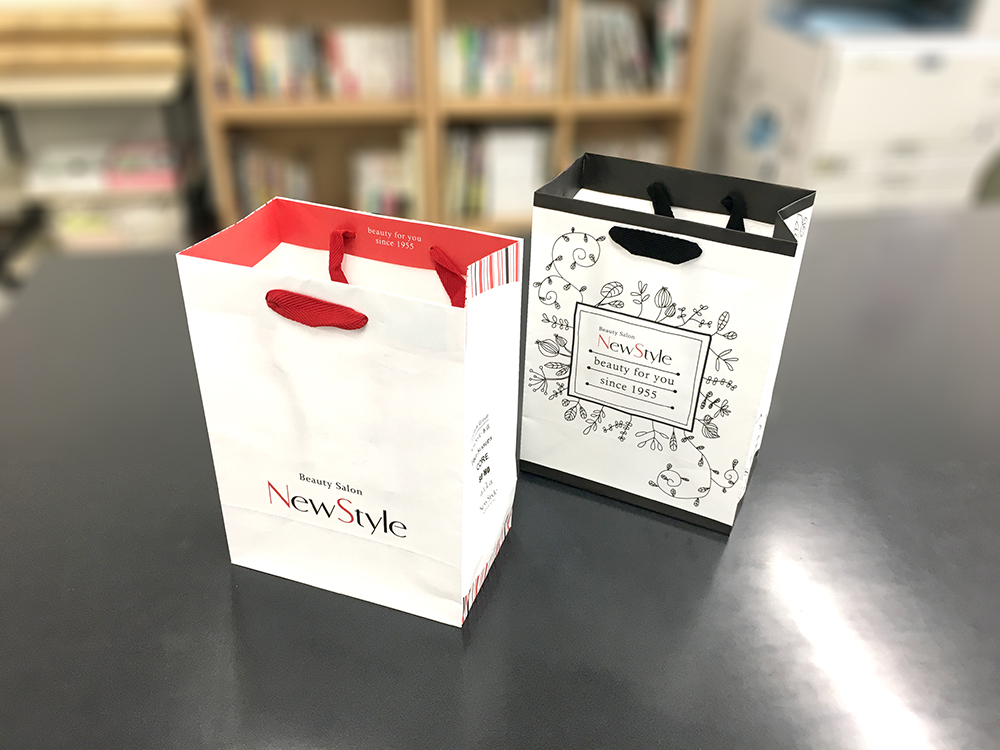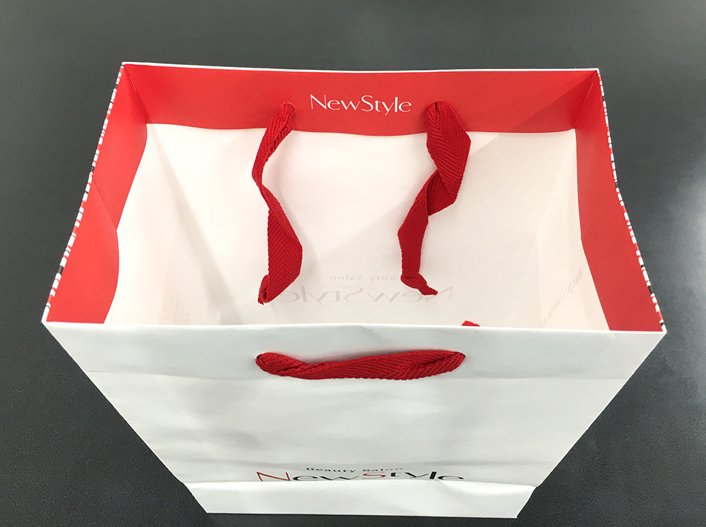 こういったデザイン、インパクトを出すために結構効果的なんですよね!手提げ袋の内側に色が付いているように見えますし、色が切り替わるところがオシャレですよねー!