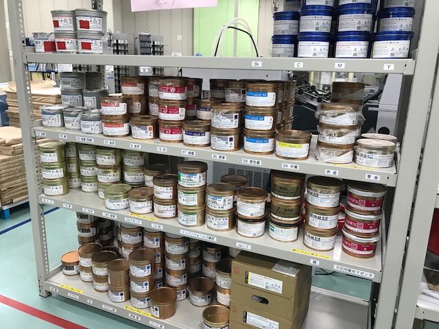 24時間の空調管理下では、一つ一つのインク缶は見た目も美しく、安定した環境での保管を心掛けております。