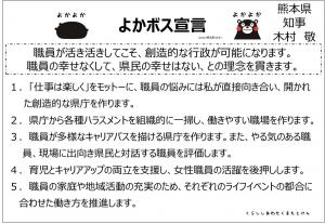 この『よかボス宣言』とは熊本県が実施しているプログラムで「熊本を支える力強い産業の復活・発展と、魅力ある雇用の創出」や「県民の結婚・出産・子育ての希望の実現」を目指し、企業のトップが、社員の仕事と、結婚や子育て介護などの充実した生活ができるよう応援することを宣言するものです。