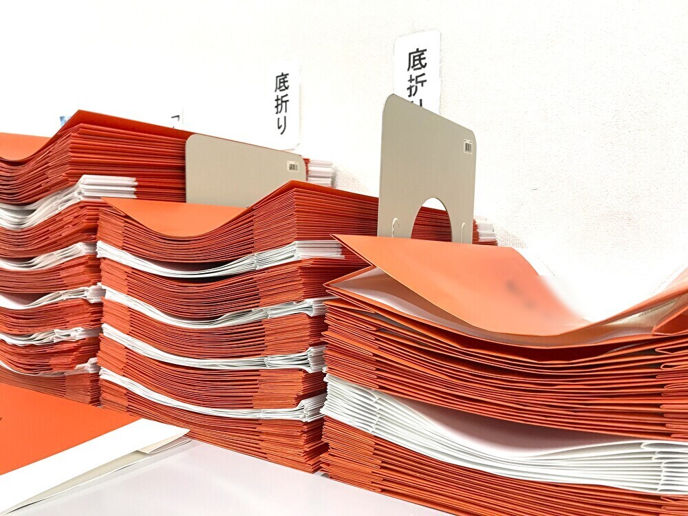 表面をマット感のあるフィルムでコーティング加工することにより高級感、耐久性ともにアップした紙袋ができあがりました。写真の状態は「マチ折り」が済んだところで、これから口折り→底づくりへと進んで行きます。