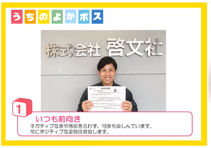 ここでいう「ボス」は企業の代表者等のことで、宣言を行った企業のことを「よかボス企業」と呼びます。ちなみに「よかボス」は、放送作家で脚本家の小山薫堂氏が名づけ親だそうです。