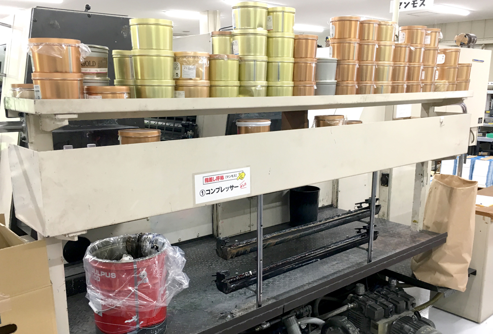 ↑場所は工場内の2台あるオフセット印刷機の1台の横にボードを設置します。