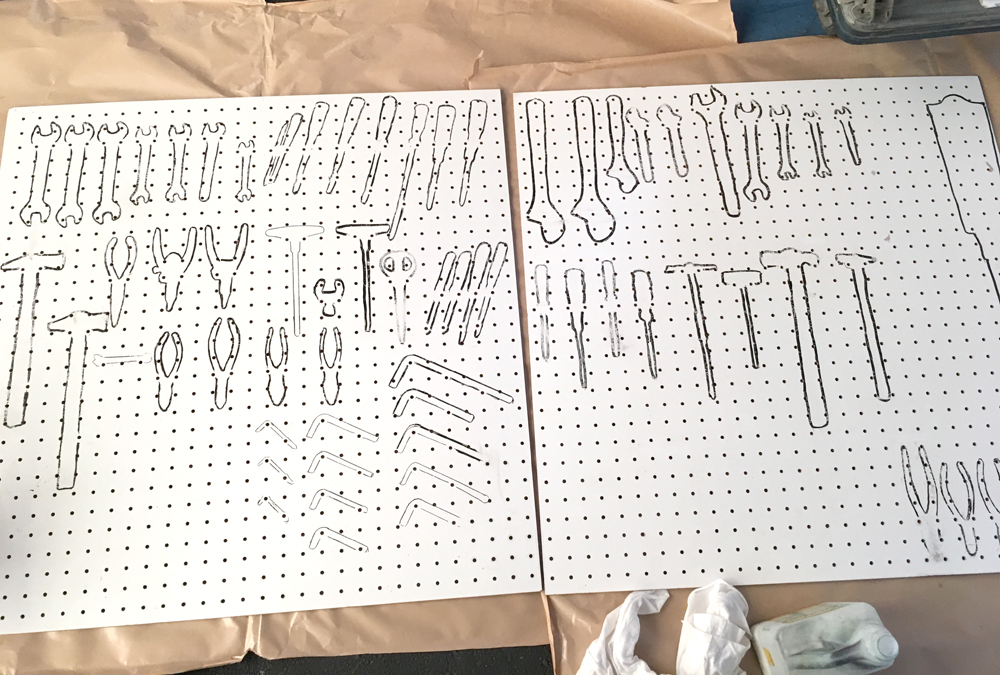 ↑そしてこれがボード代わりになる、元は工具を掛けていたものです。形跡管理をする為に工具を型取っていたので、まずは上から白のペンキで塗っていきます。