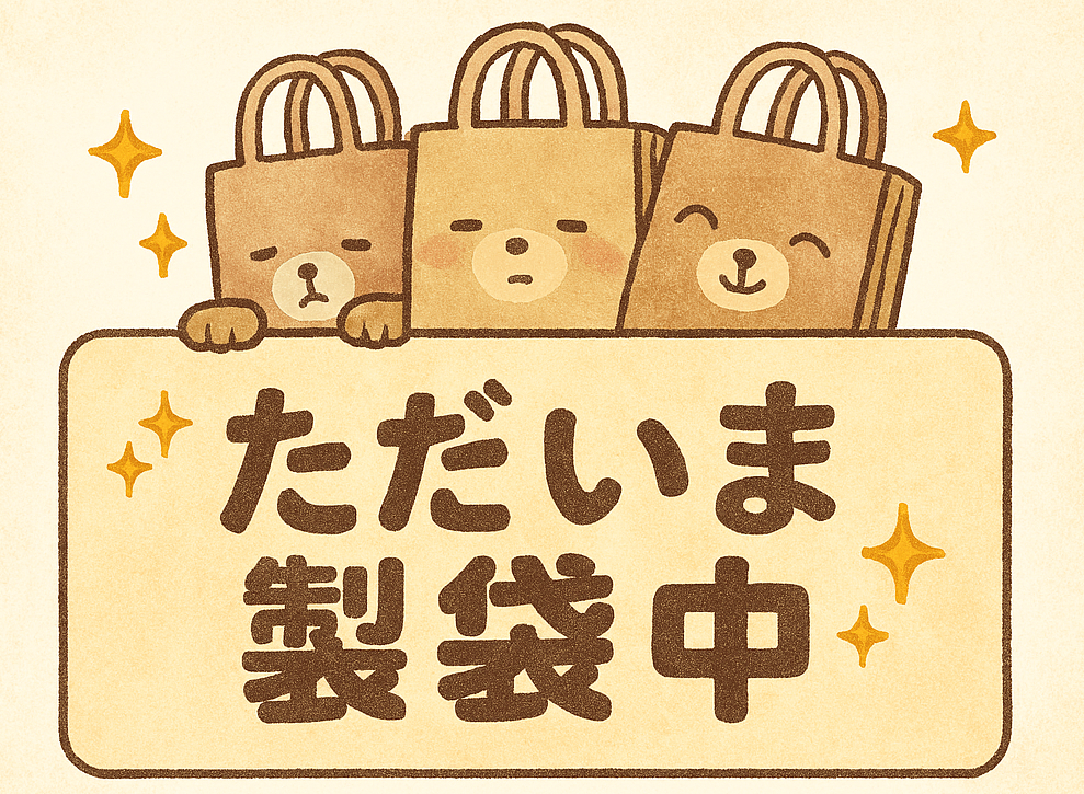 こんにちは!まっつんです この子たちは今、くま工場でせっせと袋になっている最中です。 まだちょっと寝ぼけ顔ですが、もうすぐ立派な紙袋に仕上がります。 お届けまで、もう少しだけお待ちくださいね。 オーダーやお見積もり、お問合せはこちらからどうぞ! 規格サイズ手提げ袋 規格サイズ角底袋 オリジナル手提げ袋 オリジナル角底袋
